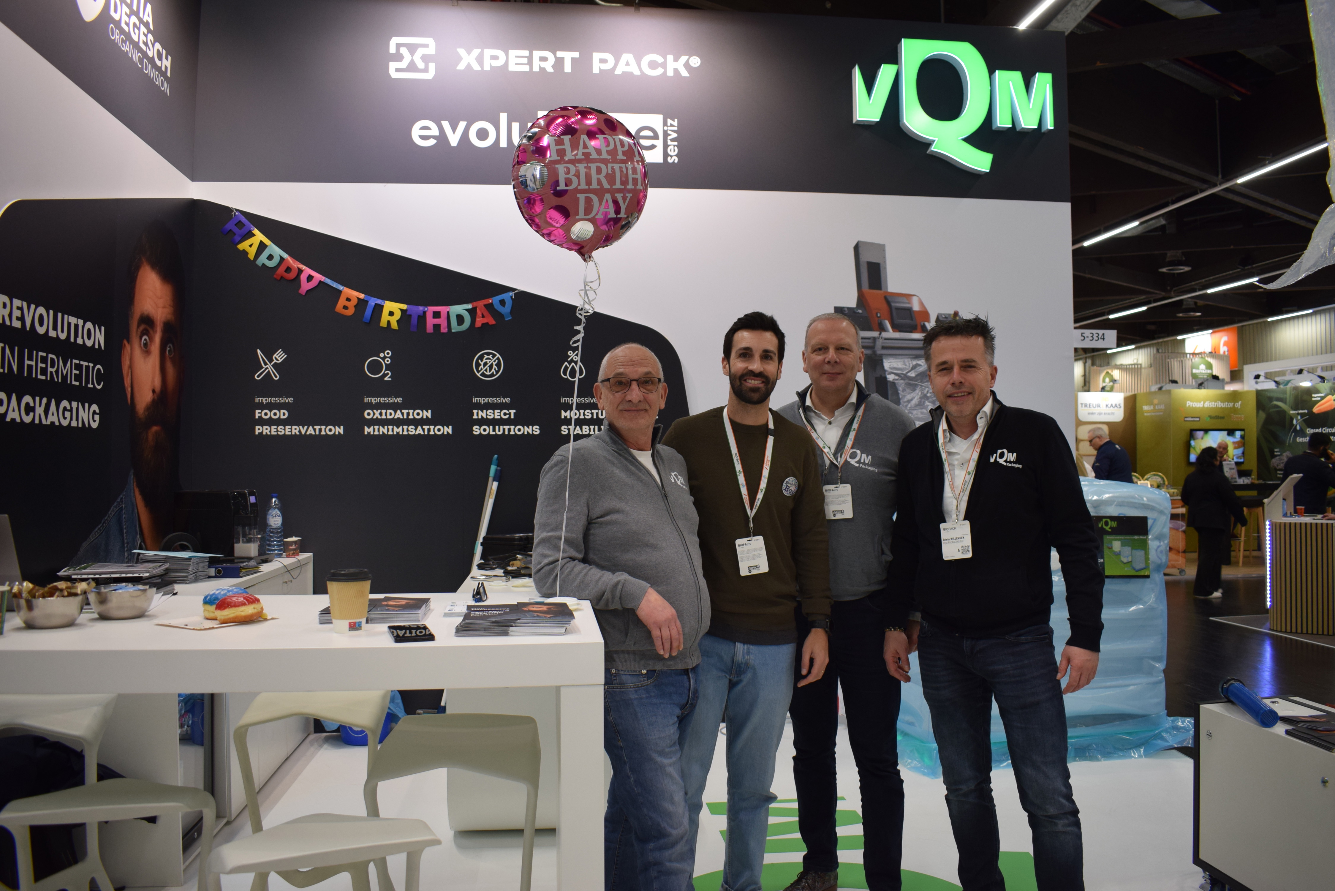 En nog een verjaardagsballonnetje voor jarige collega Juan Merida te midden van René Luyten, Marcel Mulder en Edwin Willemsen van vQm Packaging