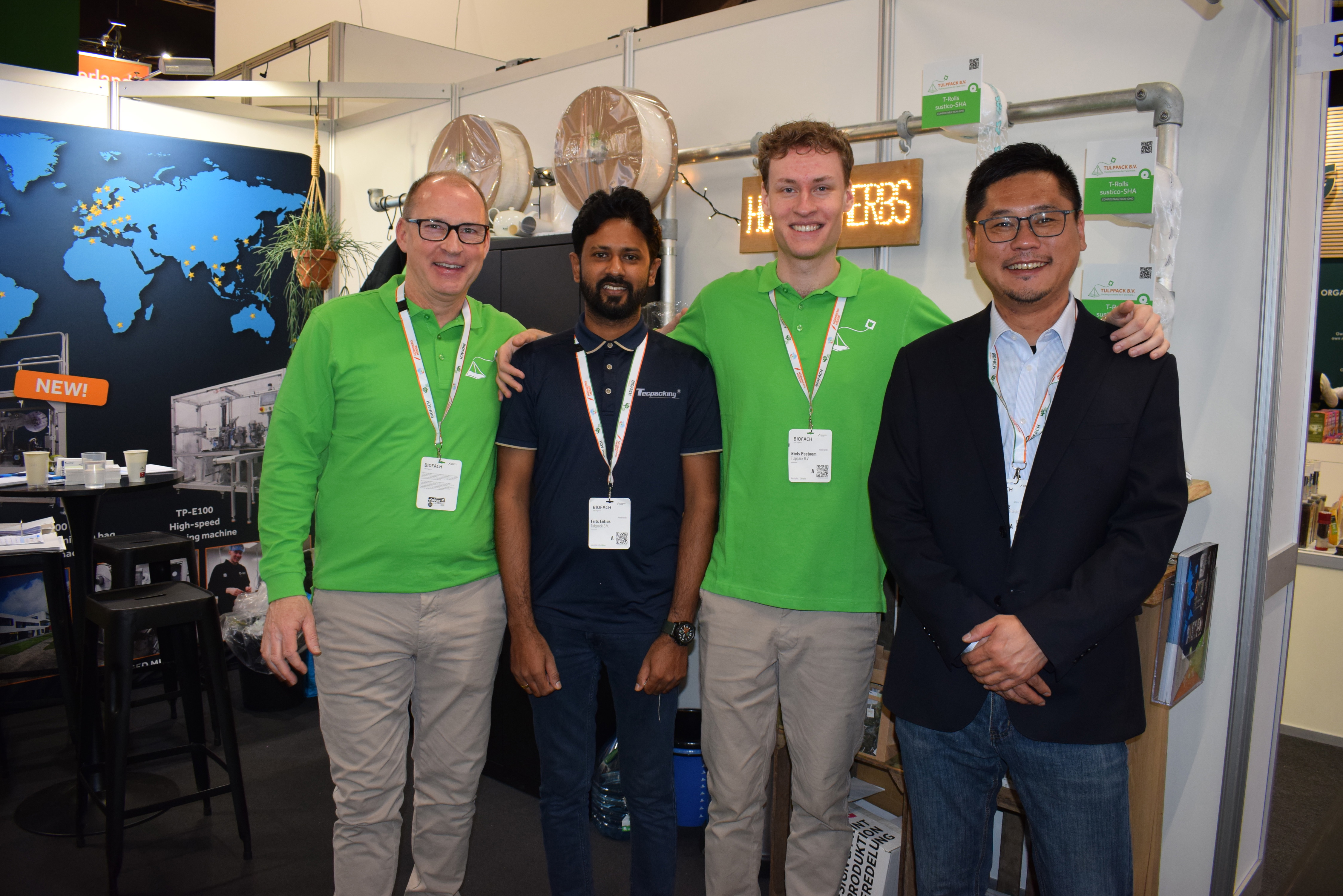 Arjen en Niels Peetoom van Tulppack in het groen met collega's PK en Paul Zhang in het donkerblauw. Thee- en kruidenverpakkers in composteerbare piramidezakjes, ofwel een huisje, vandaar de slogan Home of herbs