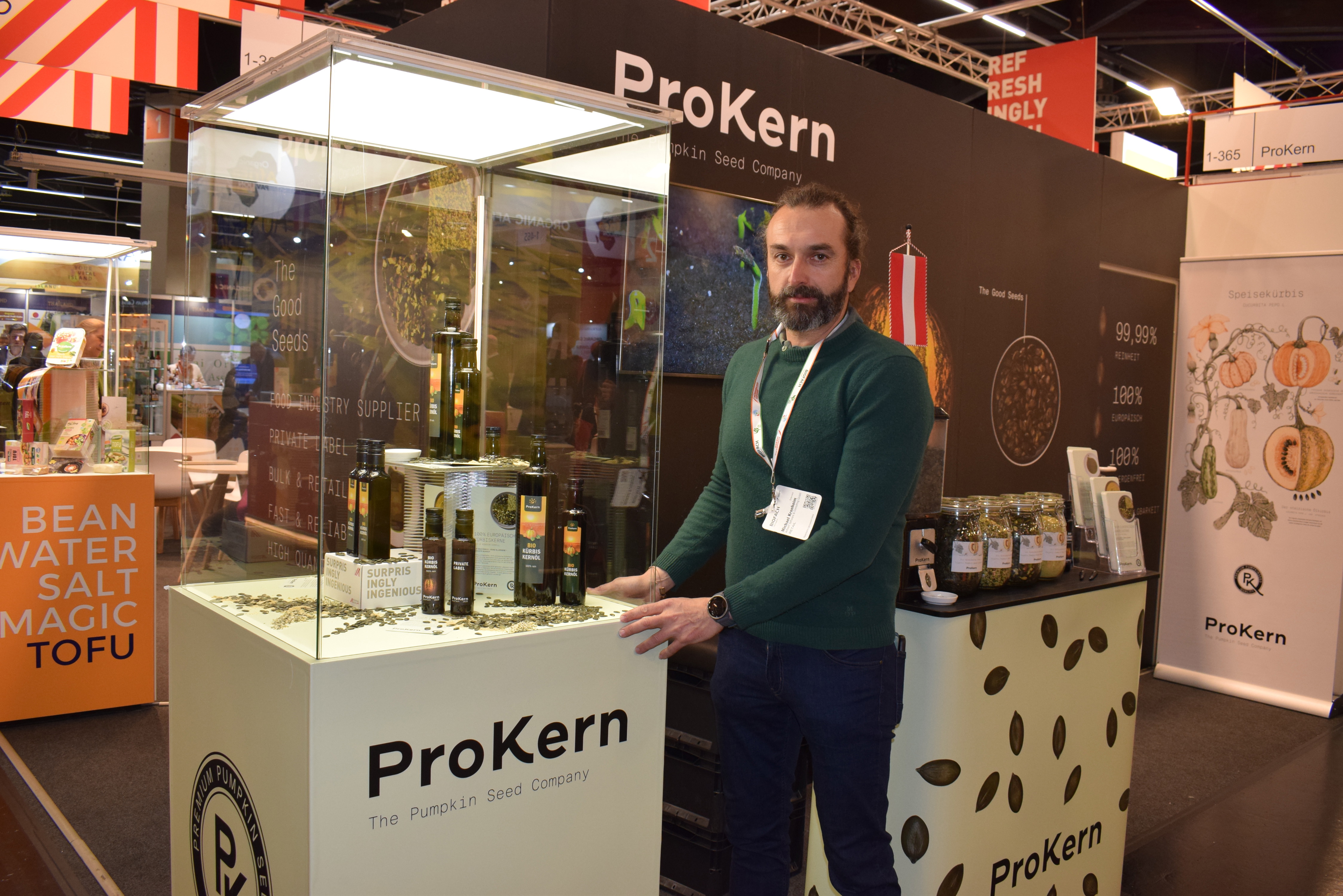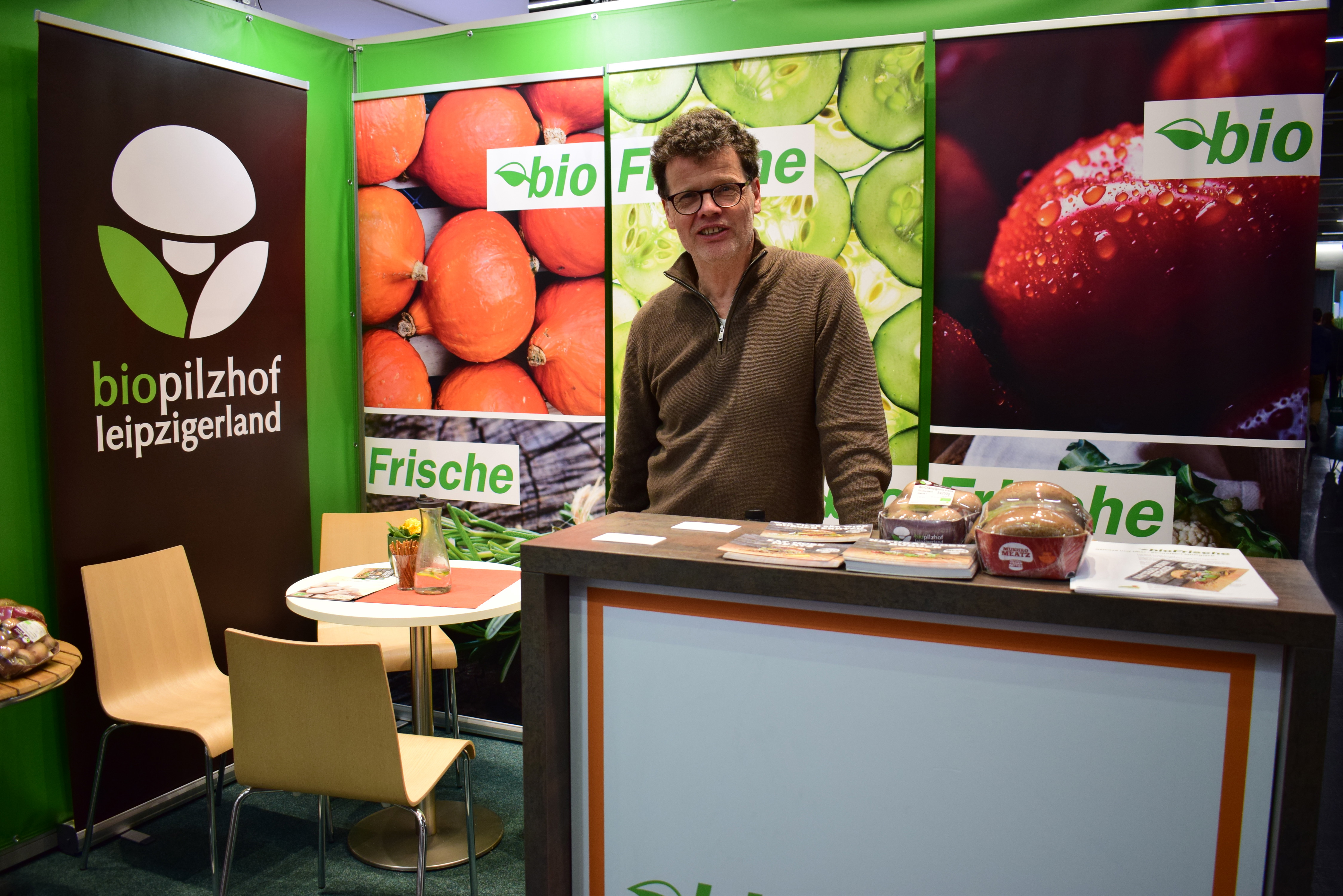 Bij de stand van Biopilzhof staat Florian Pfahler