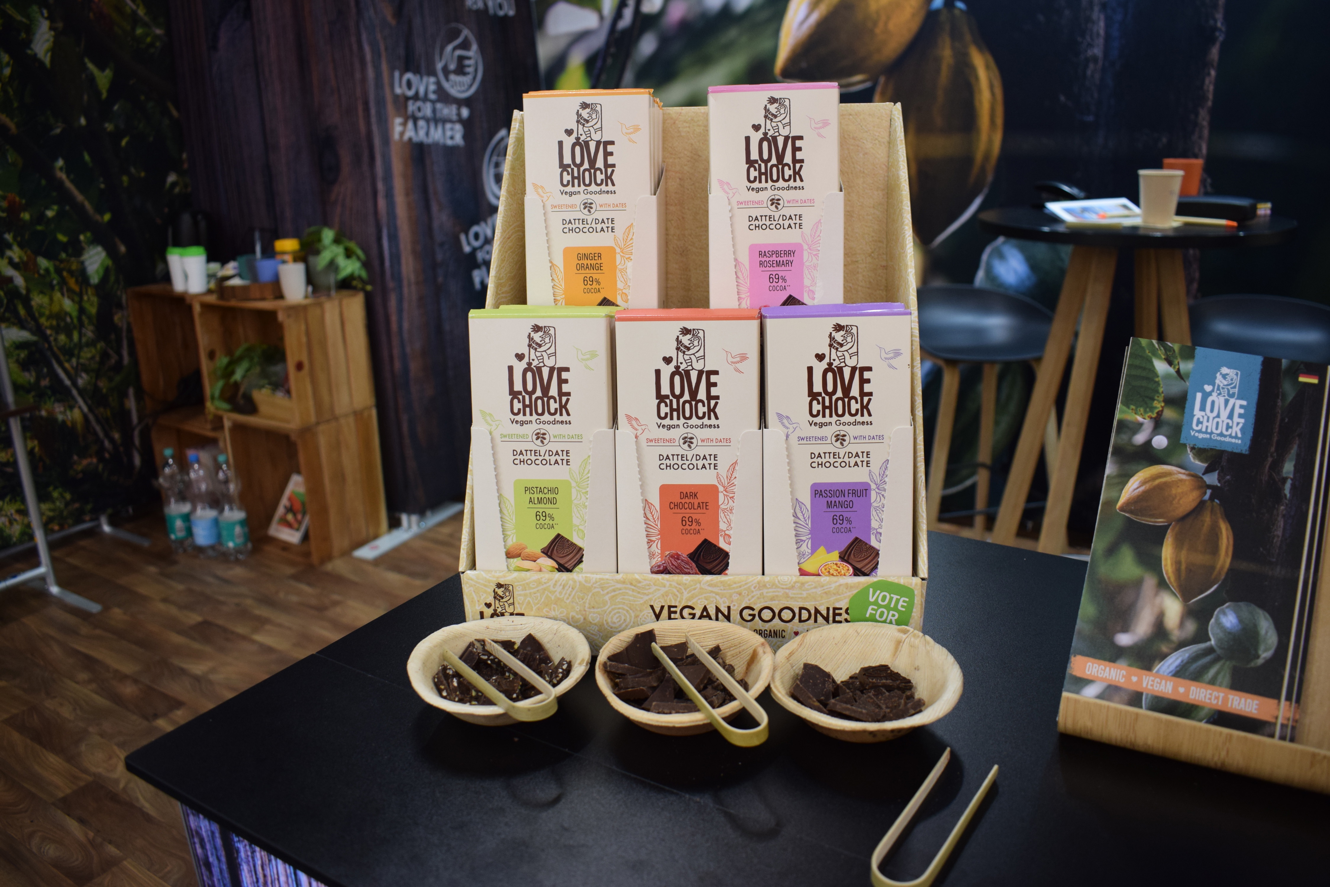 Mareike Lott, Twei Sturm, Tom Wiersma, Jonathan Schneider en Liz Wijker van Lovechock deelden de nieuwe lijn pure chocoladesmaken, tabletten zijn gezoet met dadels