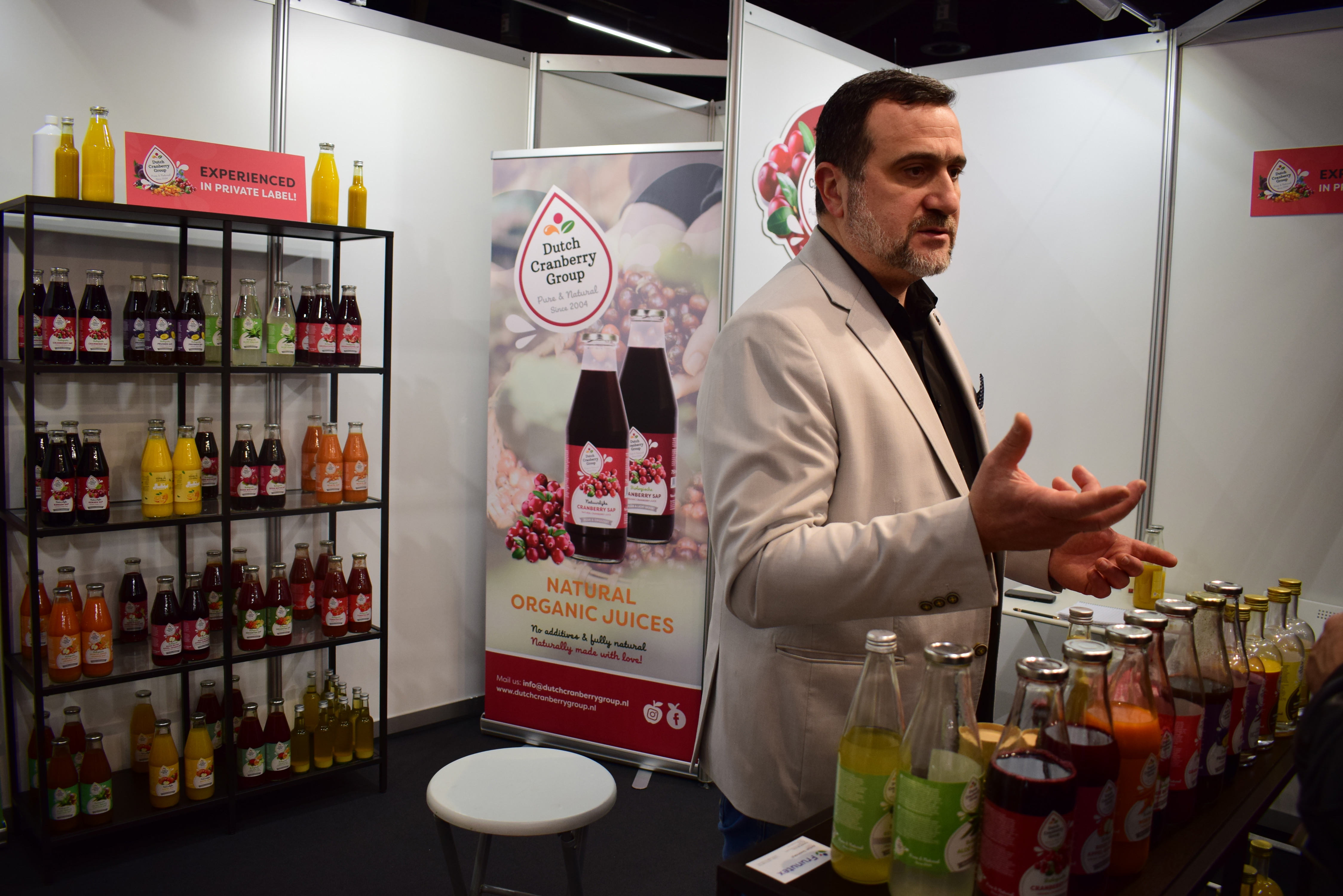 Gor Khoreyan van Dutch Cranberry Group is druk met uitschenken van de cranberrysappen
