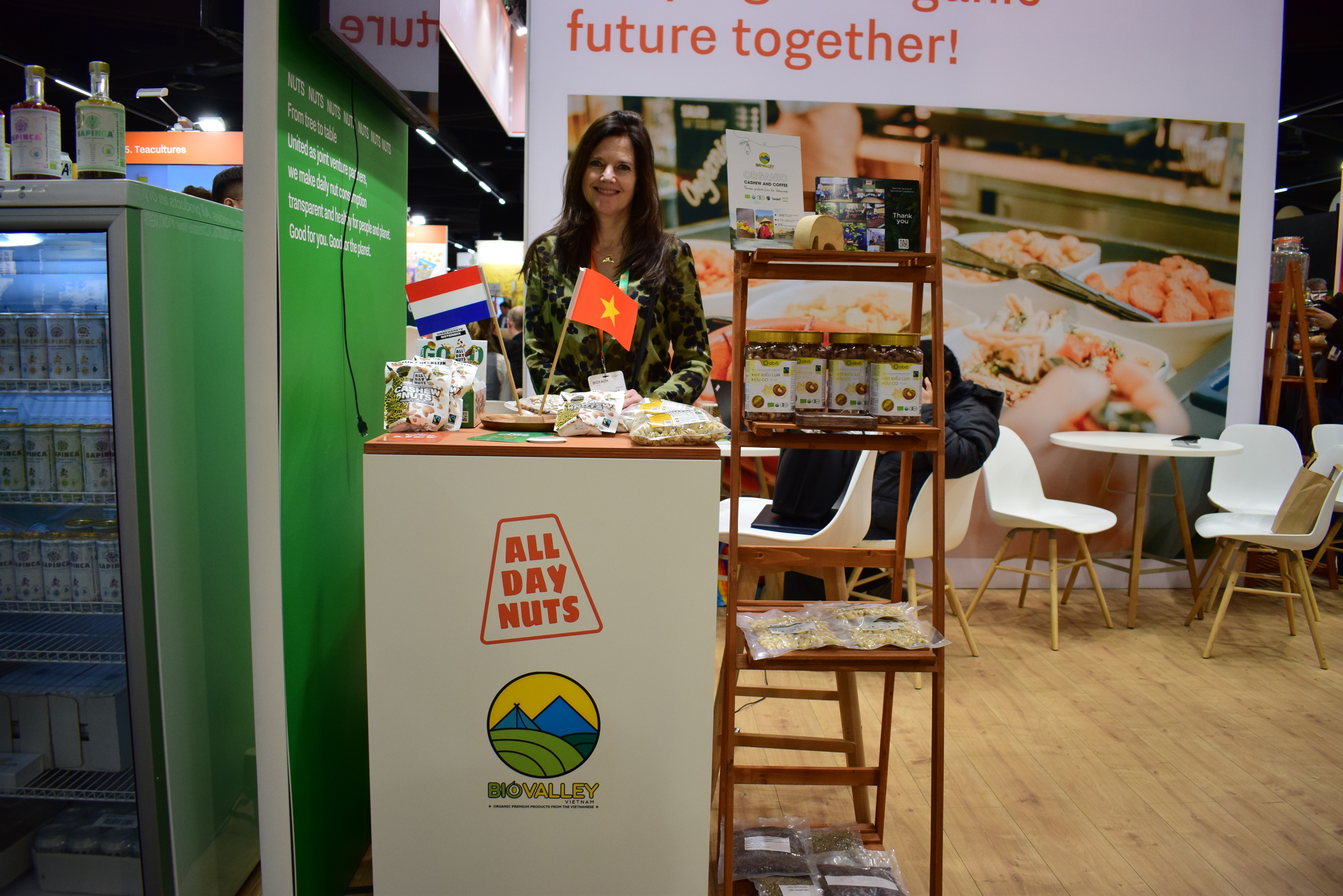 Jacqueline Poppe van Beech bp helpt de Nederlandse deelnemers aan een nieuwe stand voor BIOFACH 2027