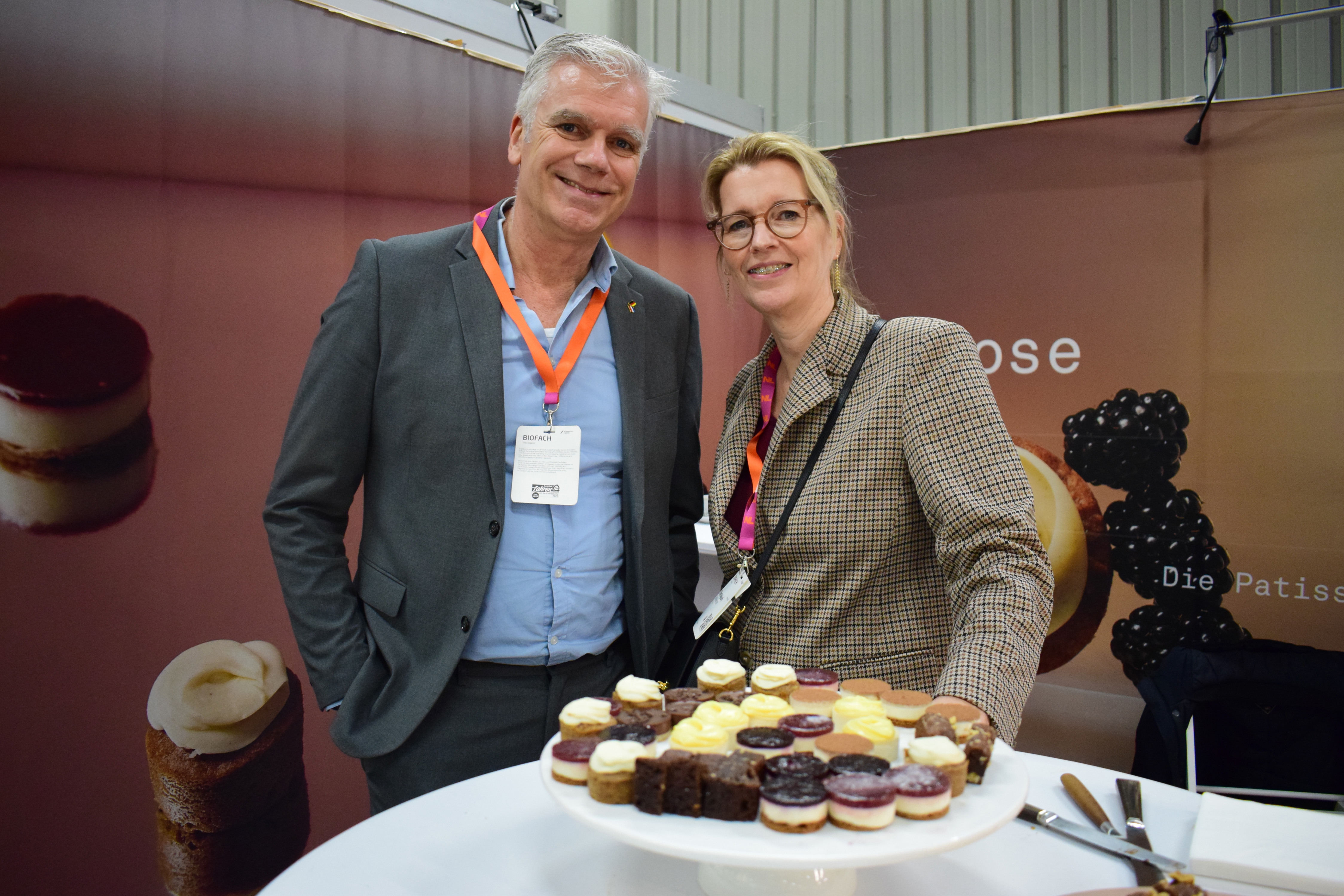 Rodger Schoester RVO en Elise Bijkerk van BioNederland wisten de taartjes van Rose & Vanilla goed te vinden, ze waren zeer te spreken over de taartjes en de meerwaarde van het NL Paviljoen waar ze beiden veel energie in hadden gestoken