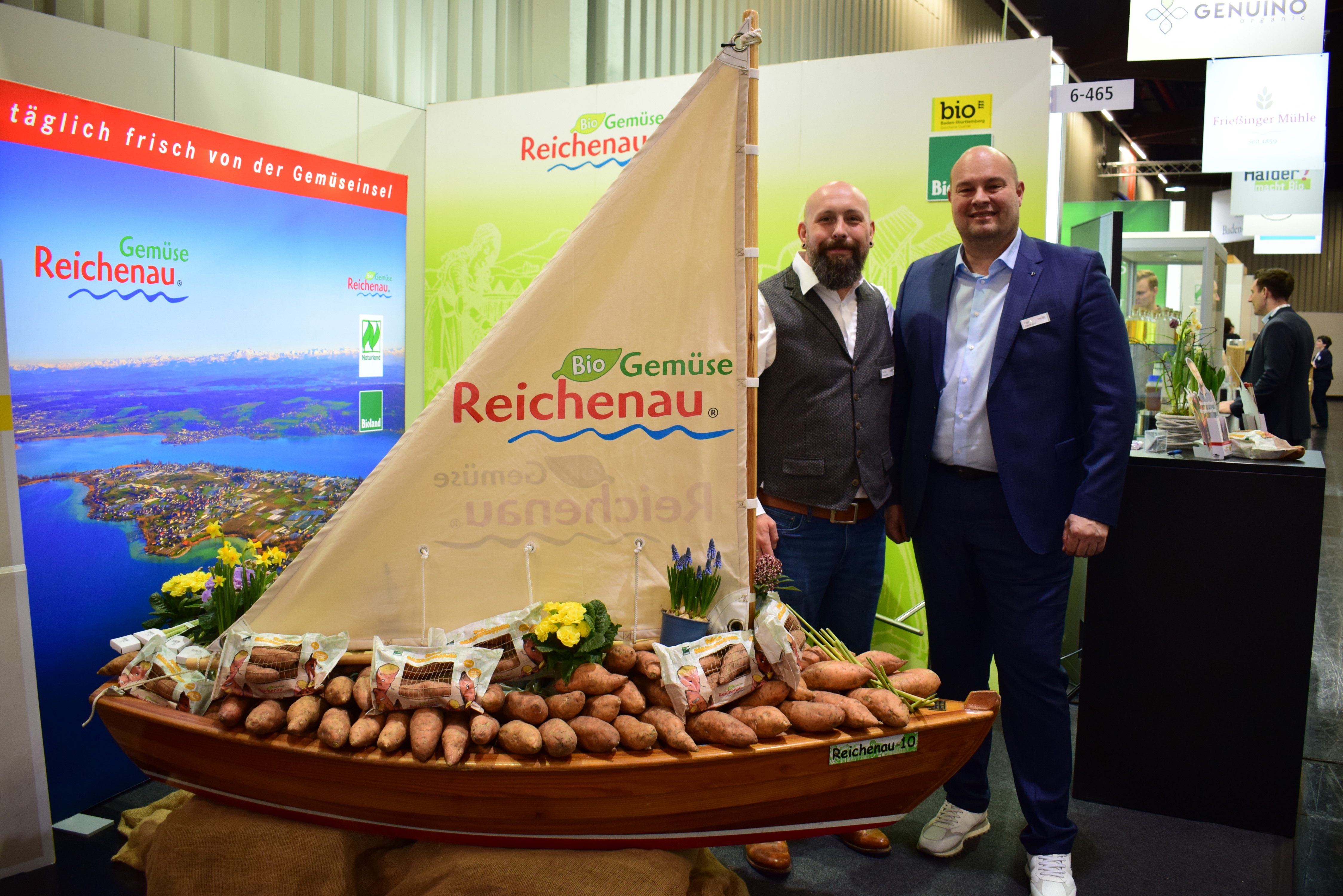 Ingo Bernhard en Simon Goretzki van Reichenau Gemüse. De zoete aardappelen worden op een eiland geteeld, vandaar de boot