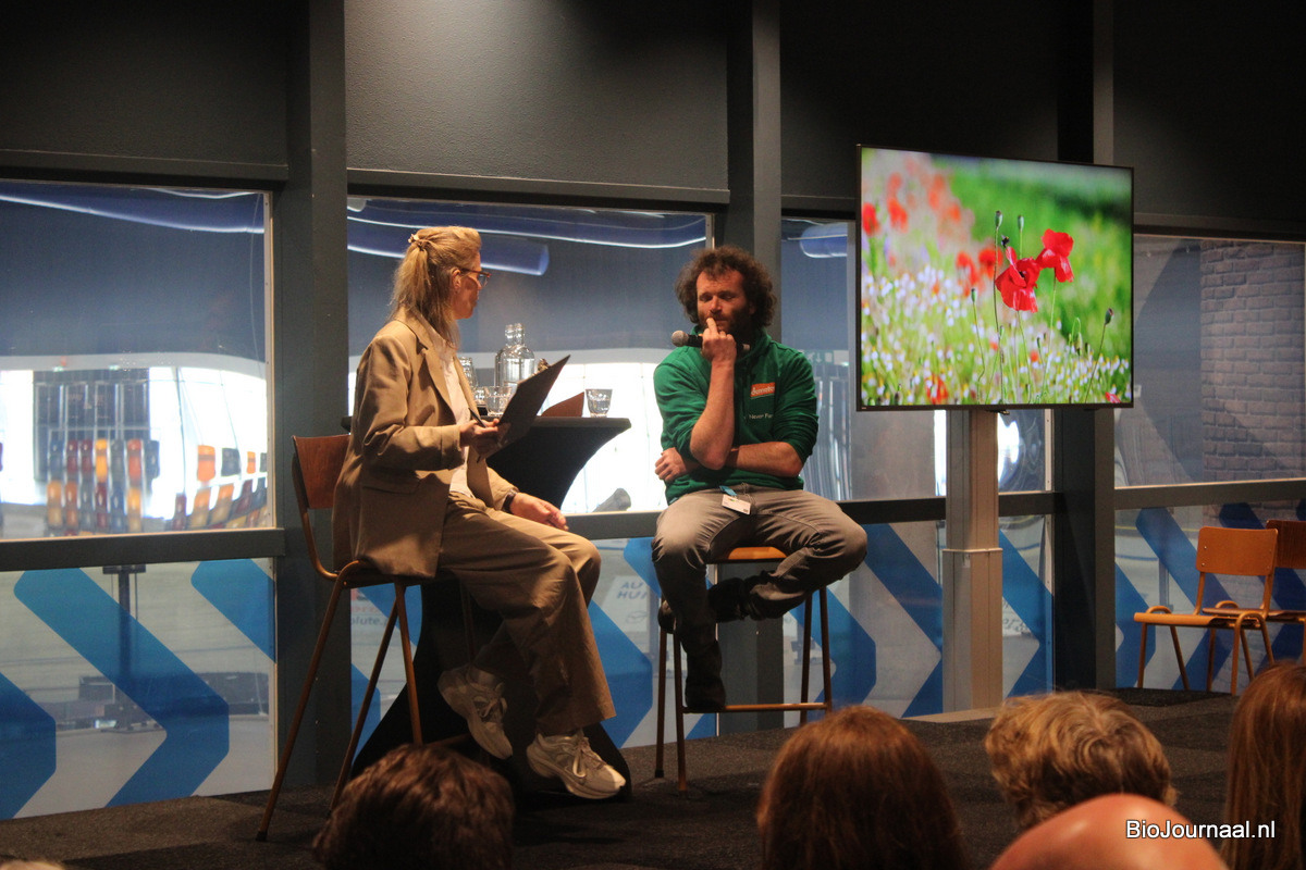 Dagvoorzitter Elise Bijkerk in gesprek met landbouwminister Jaimi van Essen.