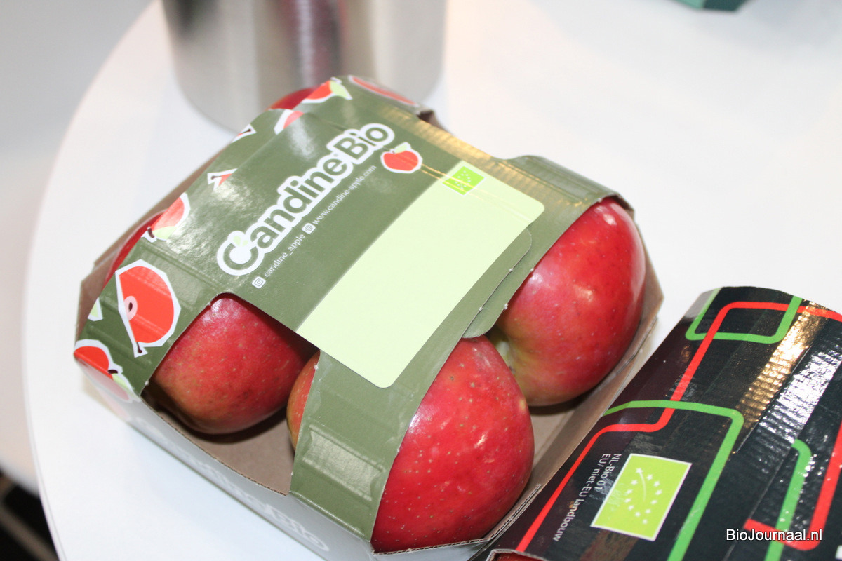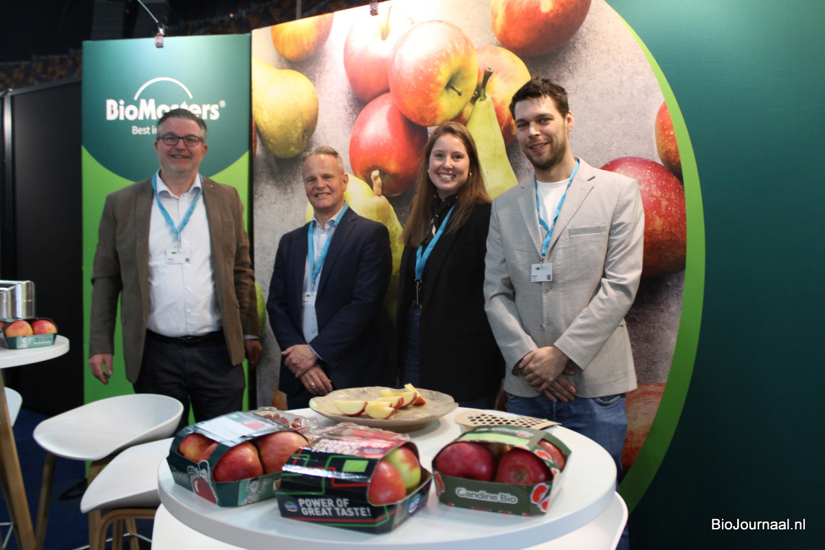 Peter van der Schoot, Harrie Jonker, Dide Franken en Kevin Verbeek presenteren de bio-appels van BioMasters.