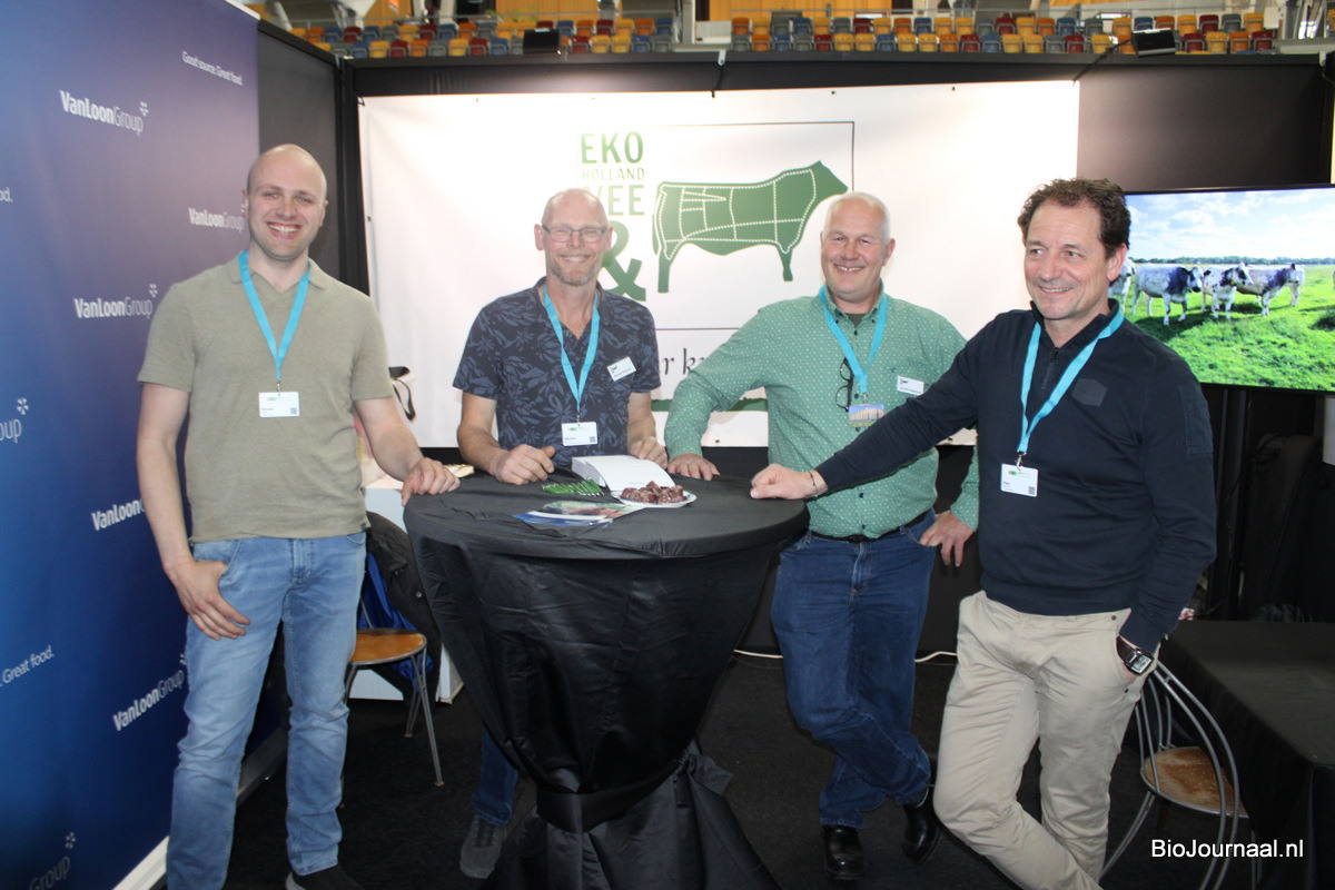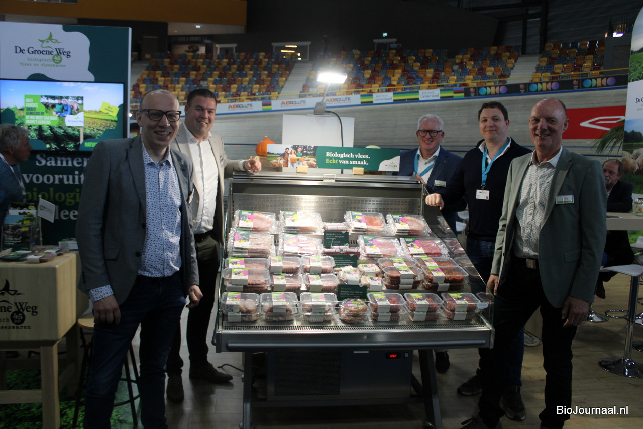 Wouter Hazeleger, John Cornelissen, Allard Bakker, Daan Tomesen en Henk Oudenampsen van De Groene Weg tonen hun assortiment biologisch vlees.