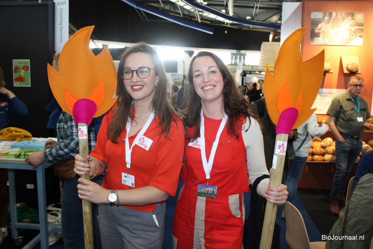 Josefien van Marlen en Christianne de Kort van BioJong steken het vuurtje aan op de Biobeurs 2026.