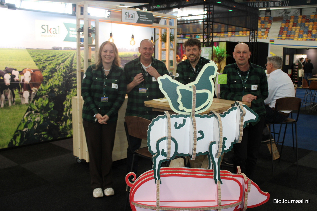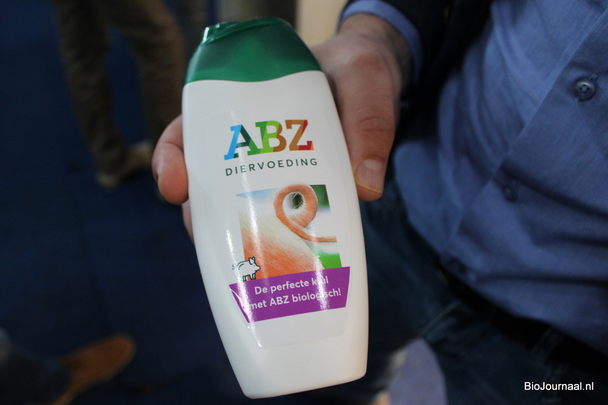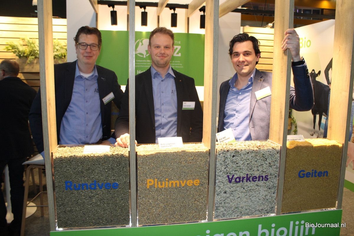 Gijsbert Thomassen, Berend Logtenberg en Stefan Regelink van ABZ Diervoeding tonen hun biolijn.