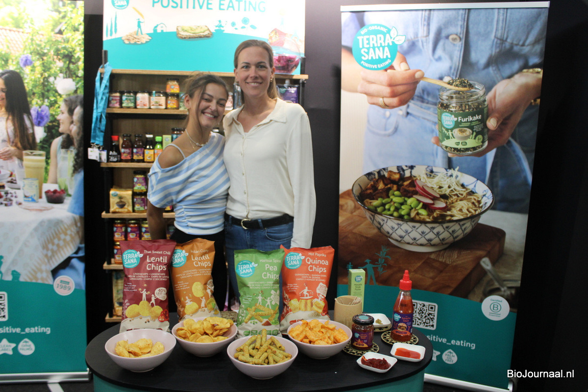 Jill van Drongelen en Belinda Barnhard van TerraSana met hun nieuwe erwten- en quinoa-chips.