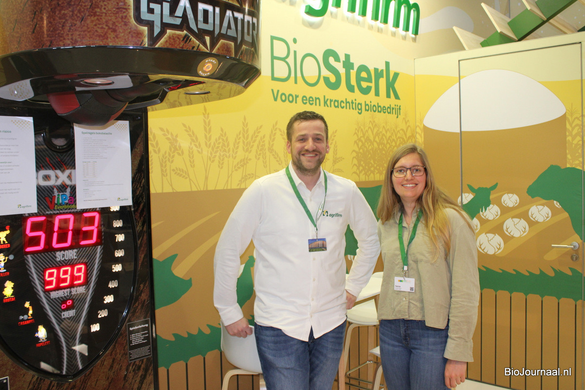 Victor Boone en Sanne van den Brink promoten het nieuwe biomerk van Agrifirm, BioSterk, op ludieke wijze met een boksmachine.