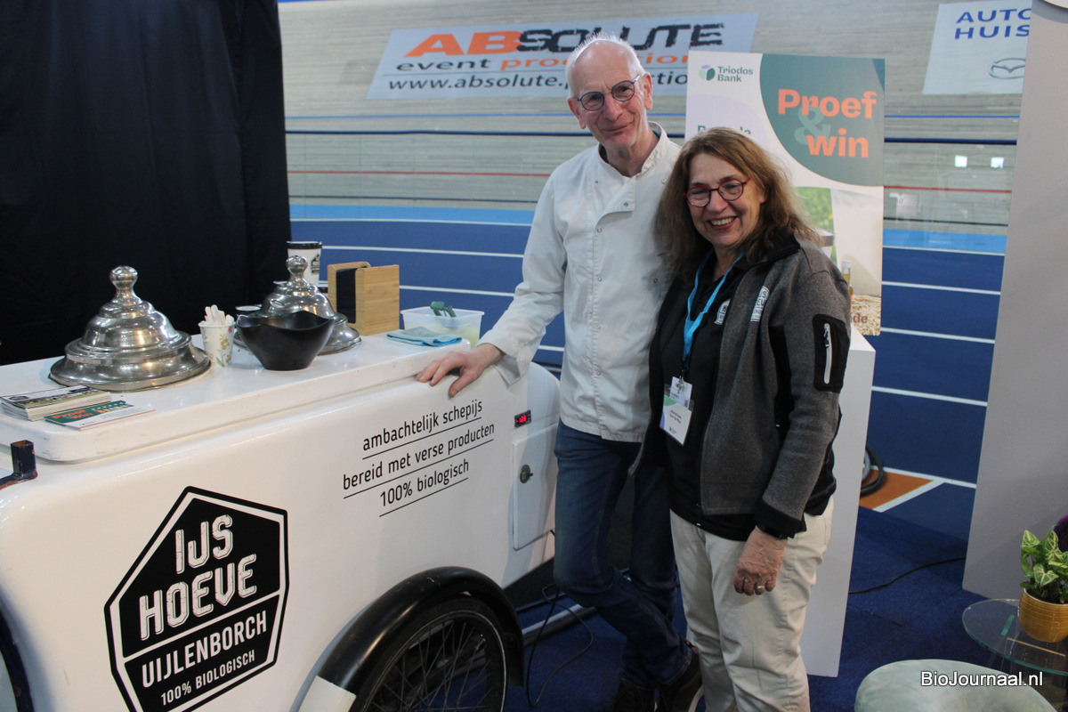 Jan Schapendonk en Annelieke van Geffen van IJshoeve Uijlenborch met hun ijskar bij de Triodos stand.