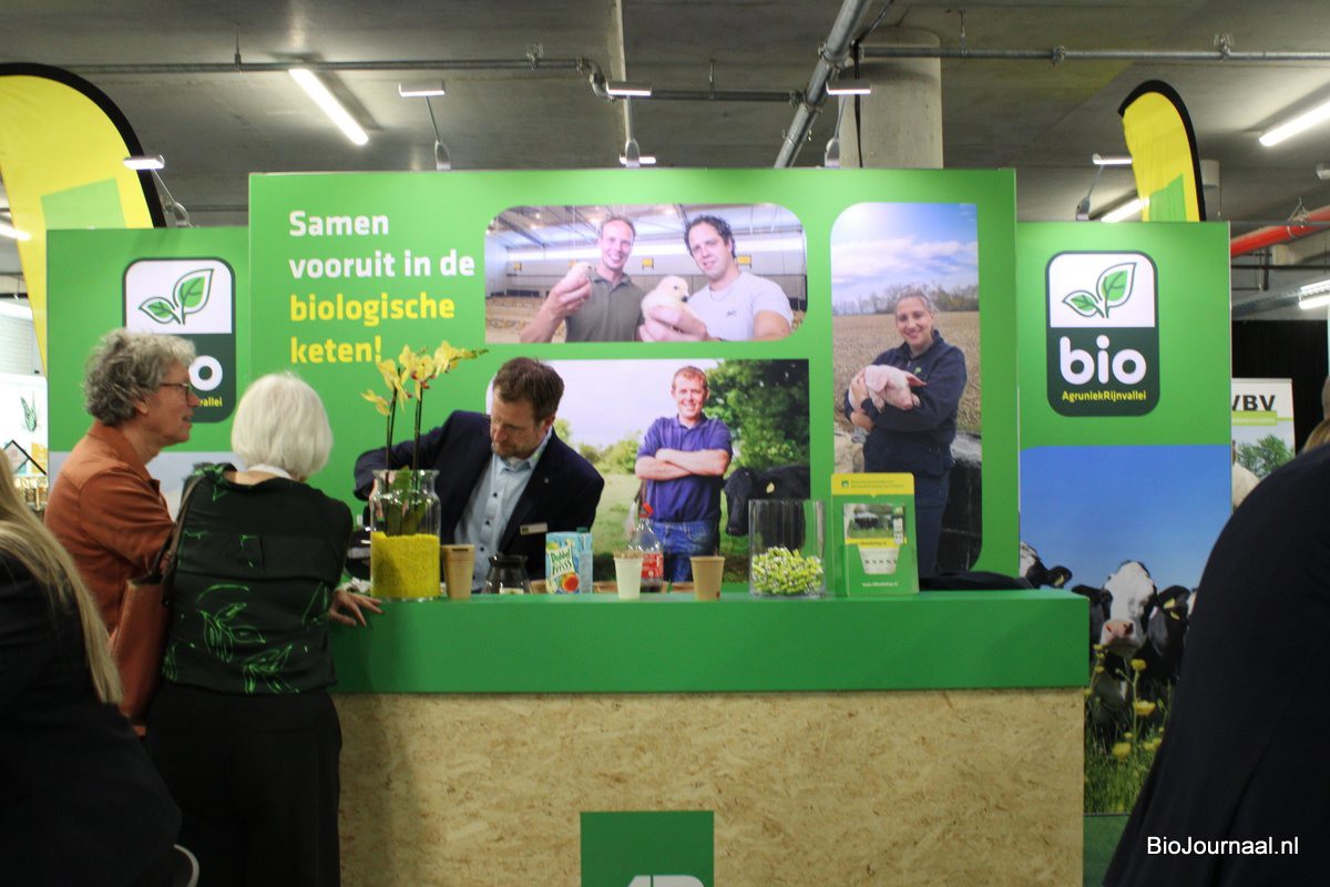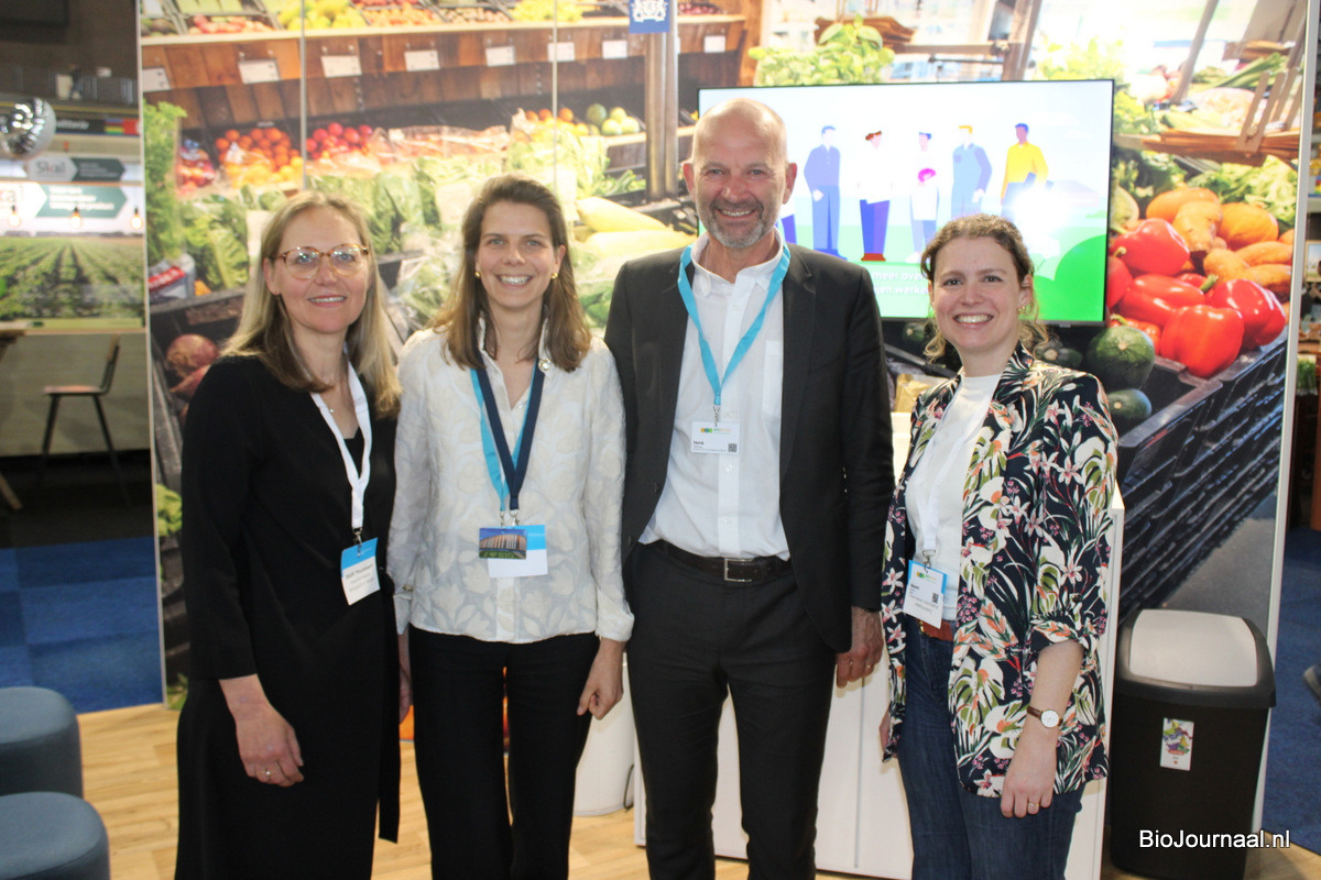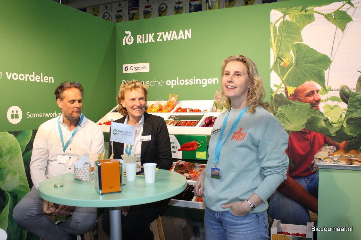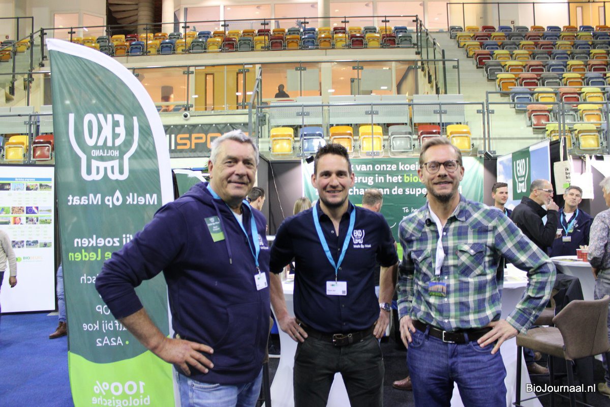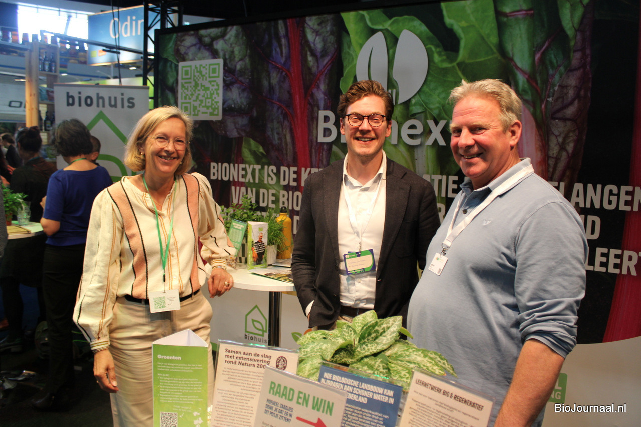 Hanneke Broekhuizen-Arts van de Biowinkelvereniging, Sander van Diepen van Biohuis en Gerard Kemper van Biologisch Limburg in de gedeelde stand van Biohuis en Bionext.