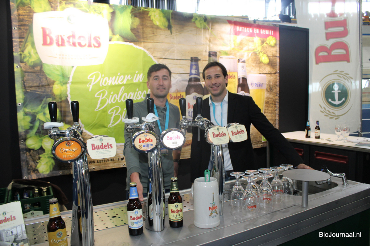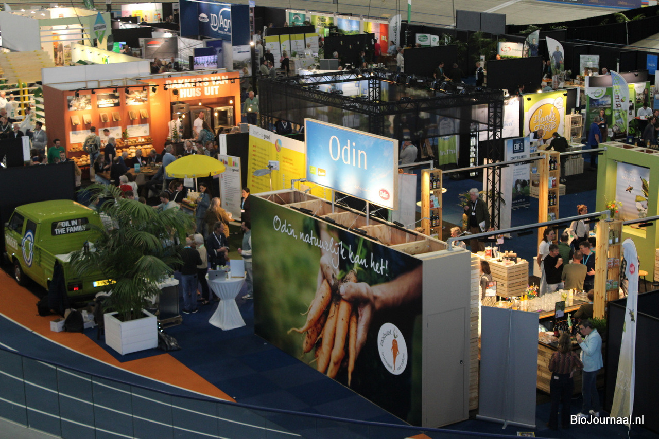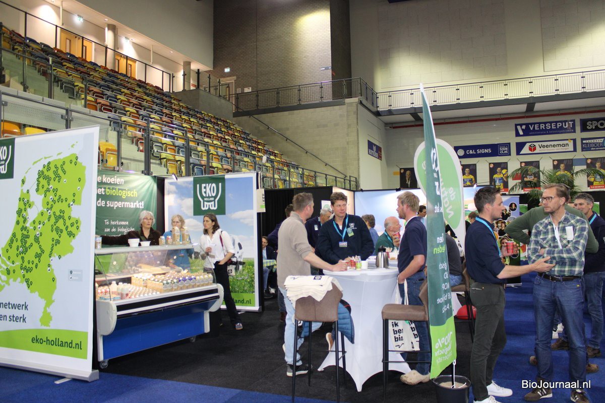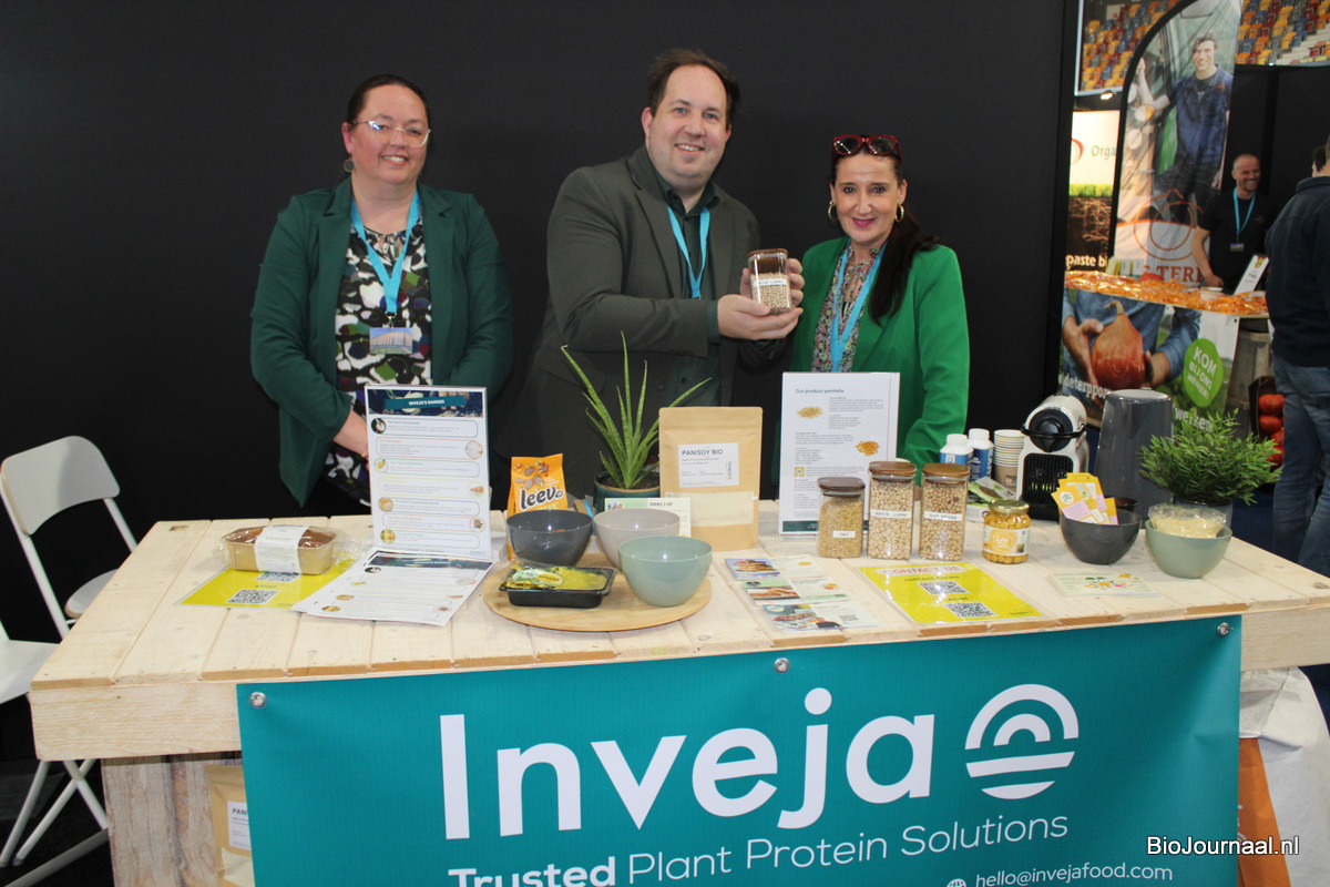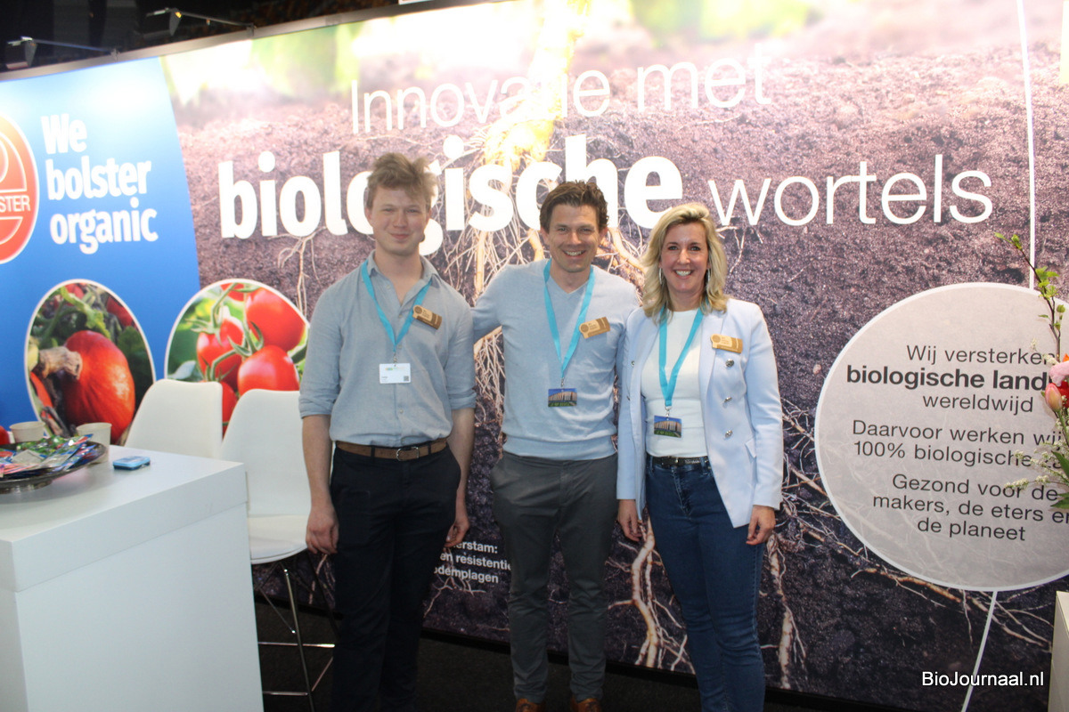 Hanneke Broekhuizen-Arts van de Biowinkelvereniging, Sander van Diepen van Biohuis en Gerard Kemper van Biologisch Limburg in de gedeelde stand van Biohuis en Bionext.