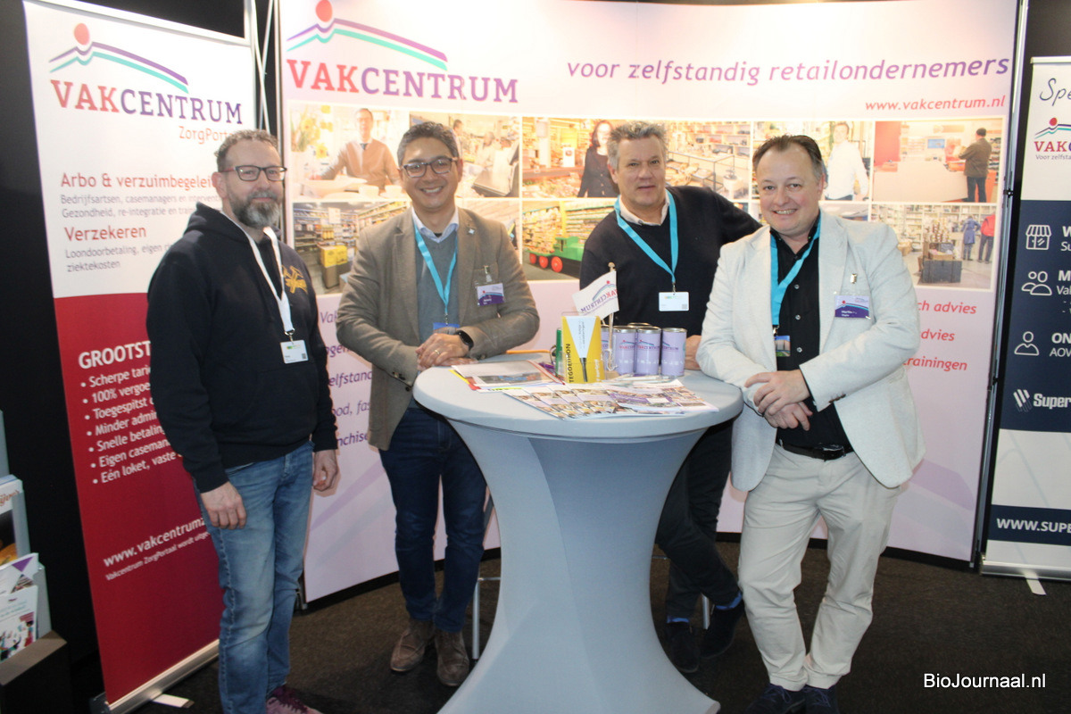 Ferry Krop van Ekoplaza, Jeremy Bish en Martin Slagter van Vakcentrum, samen met Cees van Ham van Supergarant.