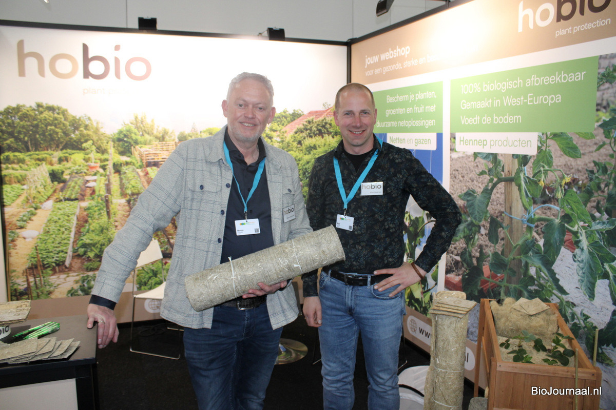 Marco Anneveldt en Ron Heijman van Hobio met hun op biologische hennep gebaseerde mulchrollen.