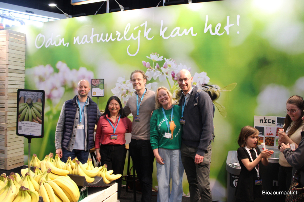 Hakim Yahyaoui, Mira Pasveer, Wouter Wezenbeek, Joyce Schoots en Sierd Hettema van Odin bij hun eerlijk geprijsde bananen.