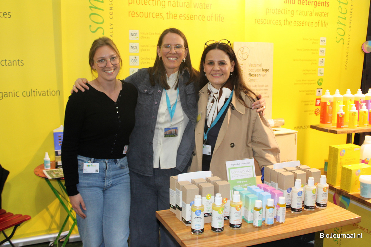 Kim Al-Huppertz, Rebecca Kramer en Kerstin Schramm van Sonett met hun milieuvriendelijke schoonmaakmiddelen en verzorgingsproducten.