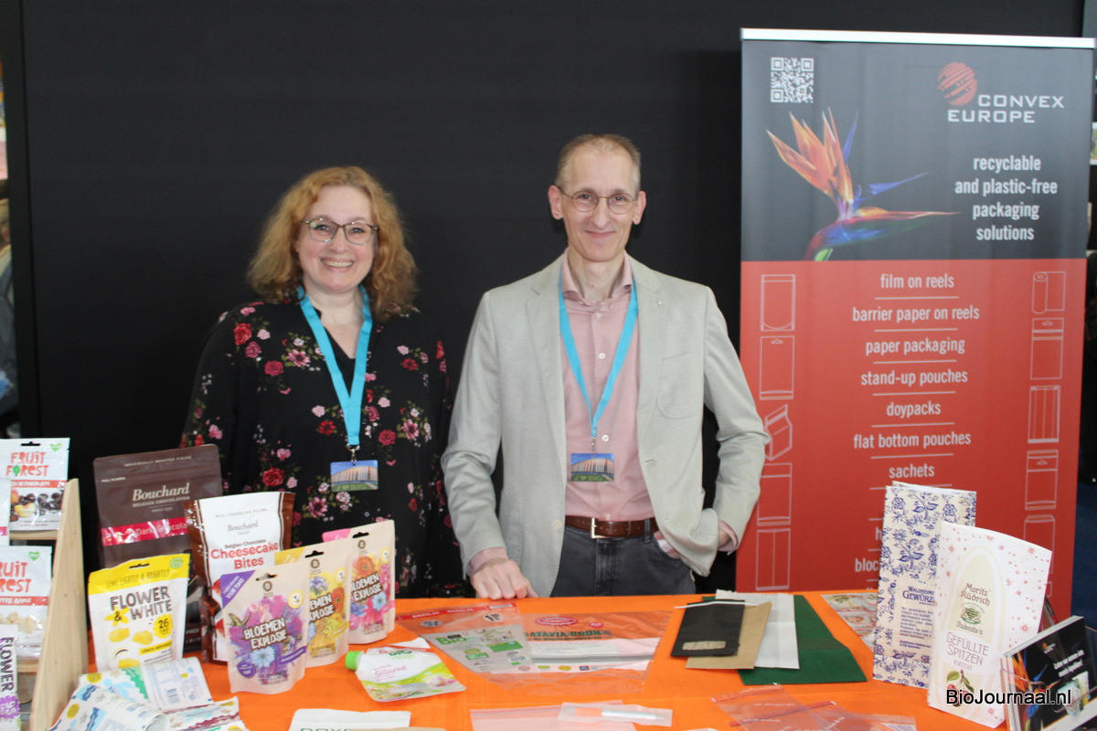 Daphne de Vos en Jörgen Jonker van Convex Europe tonen hun verantwoorde verpakkingsoplossingen.