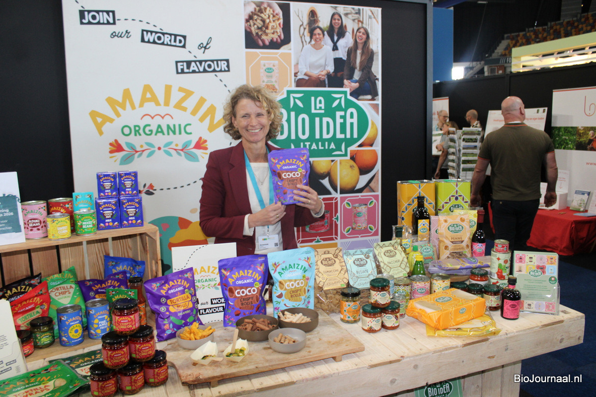 Annemiek Flantua van DO IT Organic met de chocolade-kokosrolletjes van het merk Amaizin.