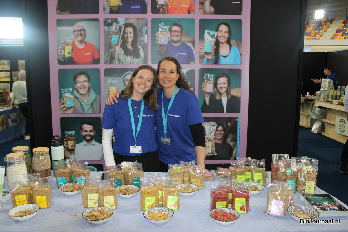Nina Roozemond en Chantal Engelen van Kari's Crackers tonen hun crackers met oude kaas, banaan, wortel, rode biet en boekweit.