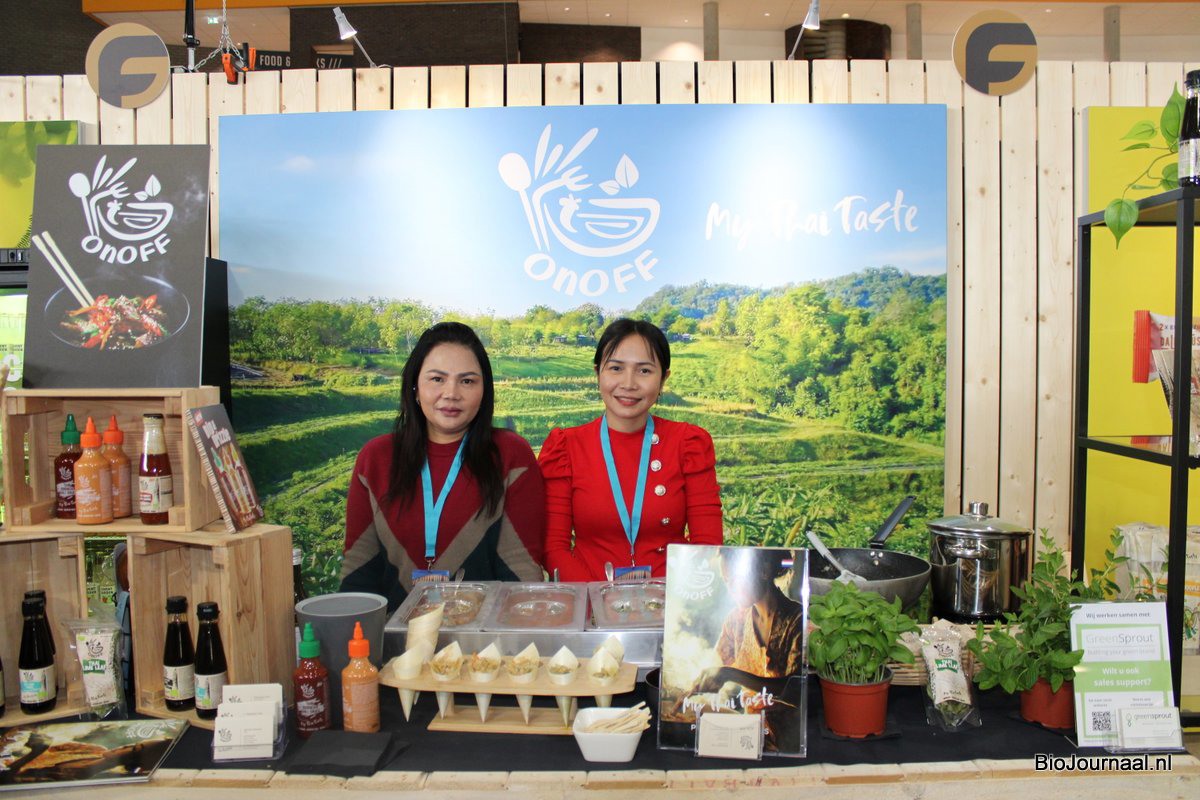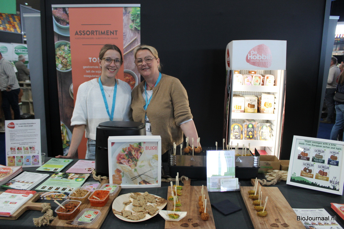 Nancy Seuren en Mireille Wagenaar van De Hobbit - Food for Freedom tonen hun assortiment veganistische snacks.