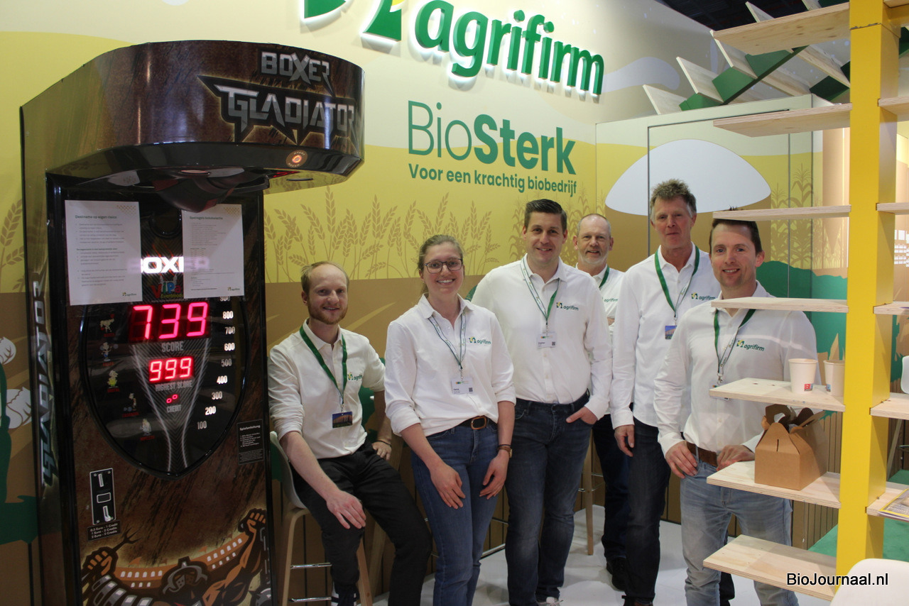 Jorrit Krom, Sanne van den Brink, Stefan de Vries, Erwin Ros, Michel van der Tuuk en Egbertjan Hilbrands van Agrifirm promoten hun nieuwe biomerk BioSterk met een boksmachine. Hoe sterk ben jij?