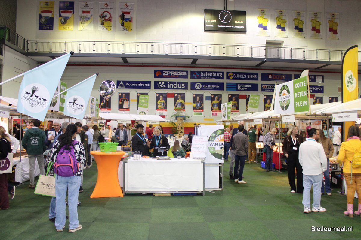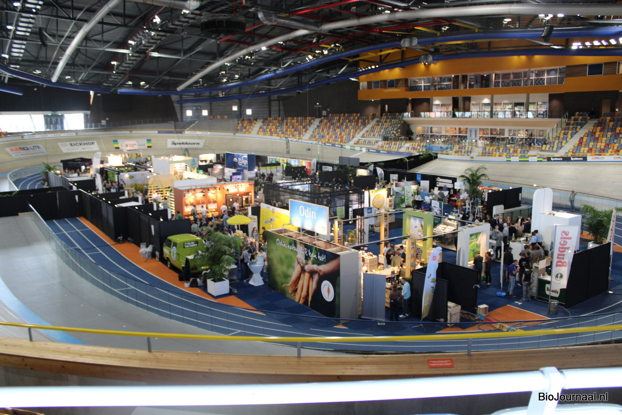 Een van de drie zalen van de Biobeurs zit ingeklemd in de wielerbaan van Omnisport Apeldoorn.