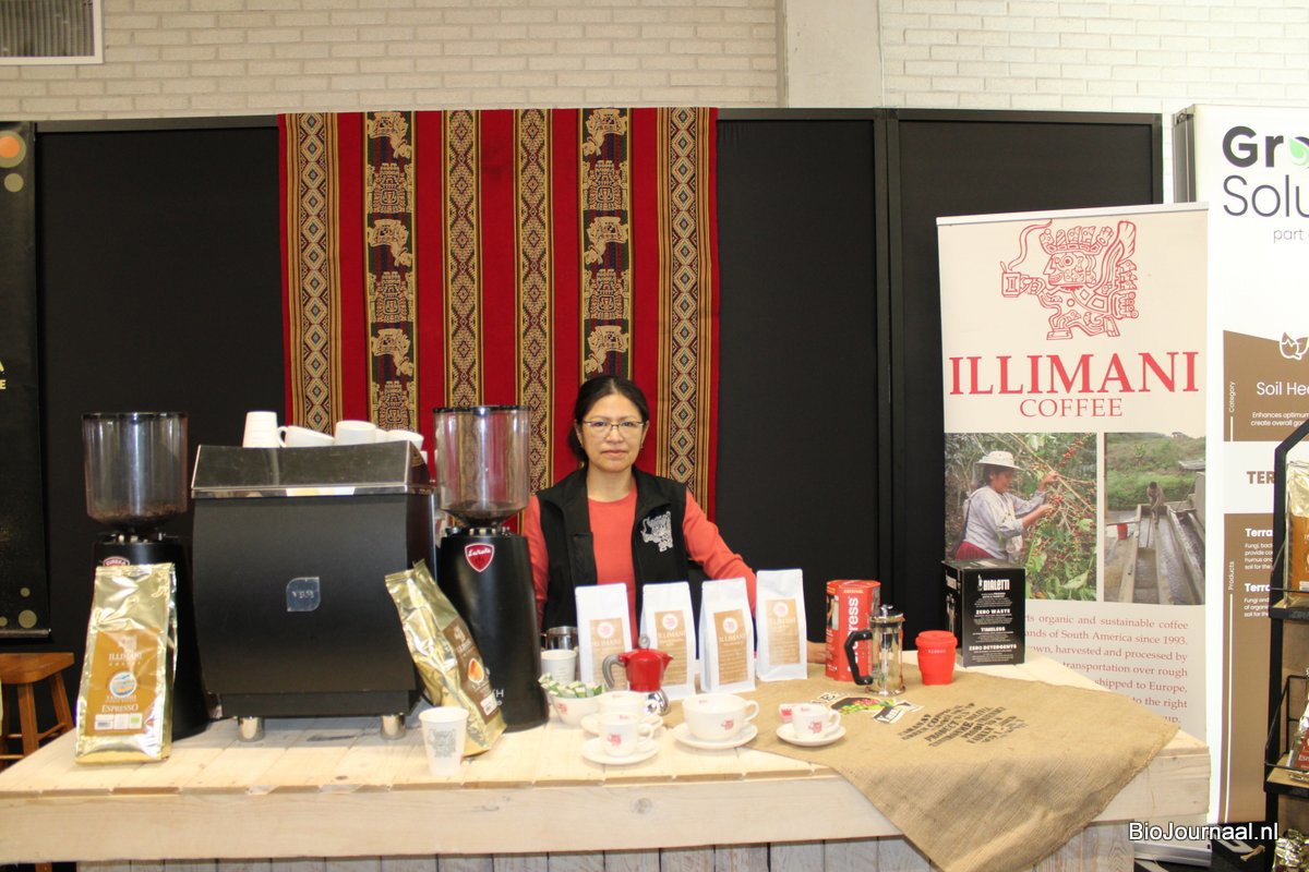 Gloria Beek van Illimani. Zuid-Amerikaanse koffiebonen die onder andere worden verbouwd op de grond van de Inca’s. Hun logo is een zonnegod die een kopje koffie drinkt.