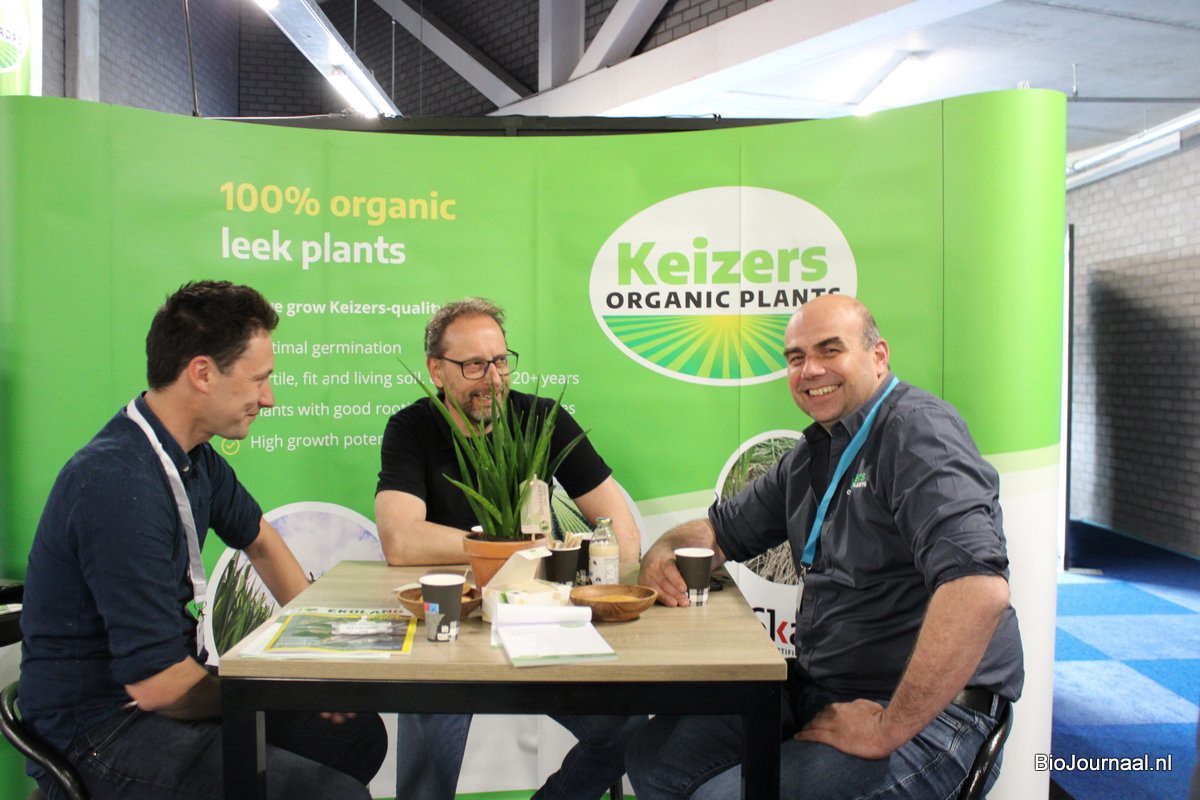 Johan Tielen (rechts) van Keizers Organic Plants in gesprek met zijn concullega's. Keizers expertise ligt in het telen van biologische preiplanten.