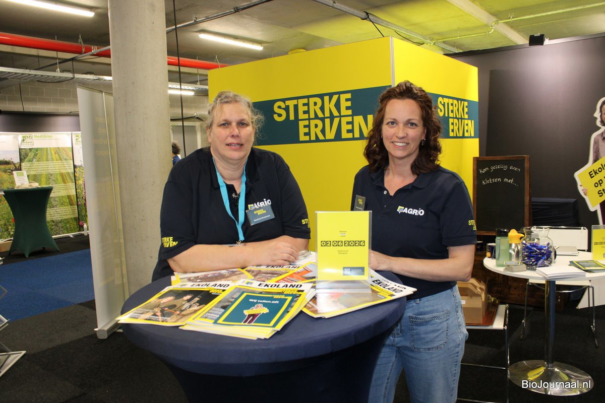 Hendrien Braakman en Karin van den Berg van Ekoland die hun naamsverandering naar ‘Sterke Erven’ promoten met hun stand