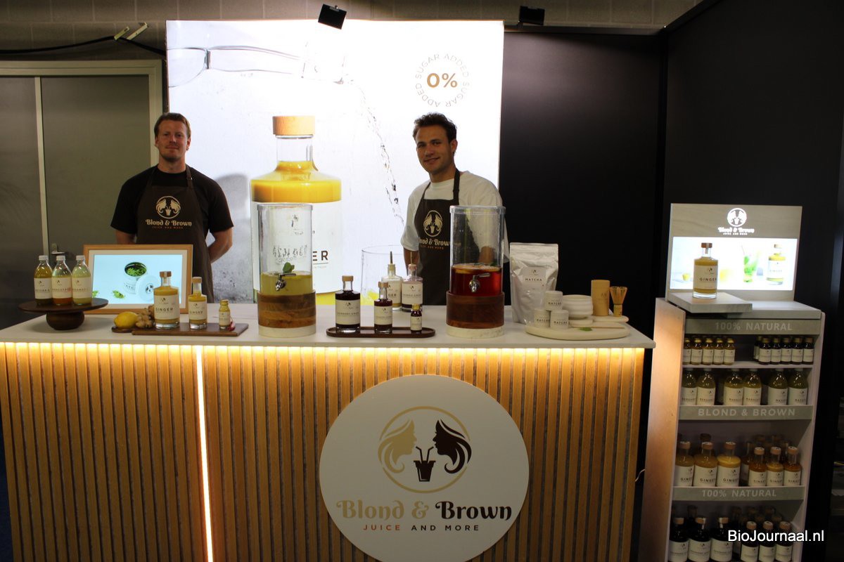 Olle Draijer en Jasper Otten van Blond and brown juices met hun gembershots, limonades en sappen. In hun winkel in Leidschendam is de Matcha de bestseller.
