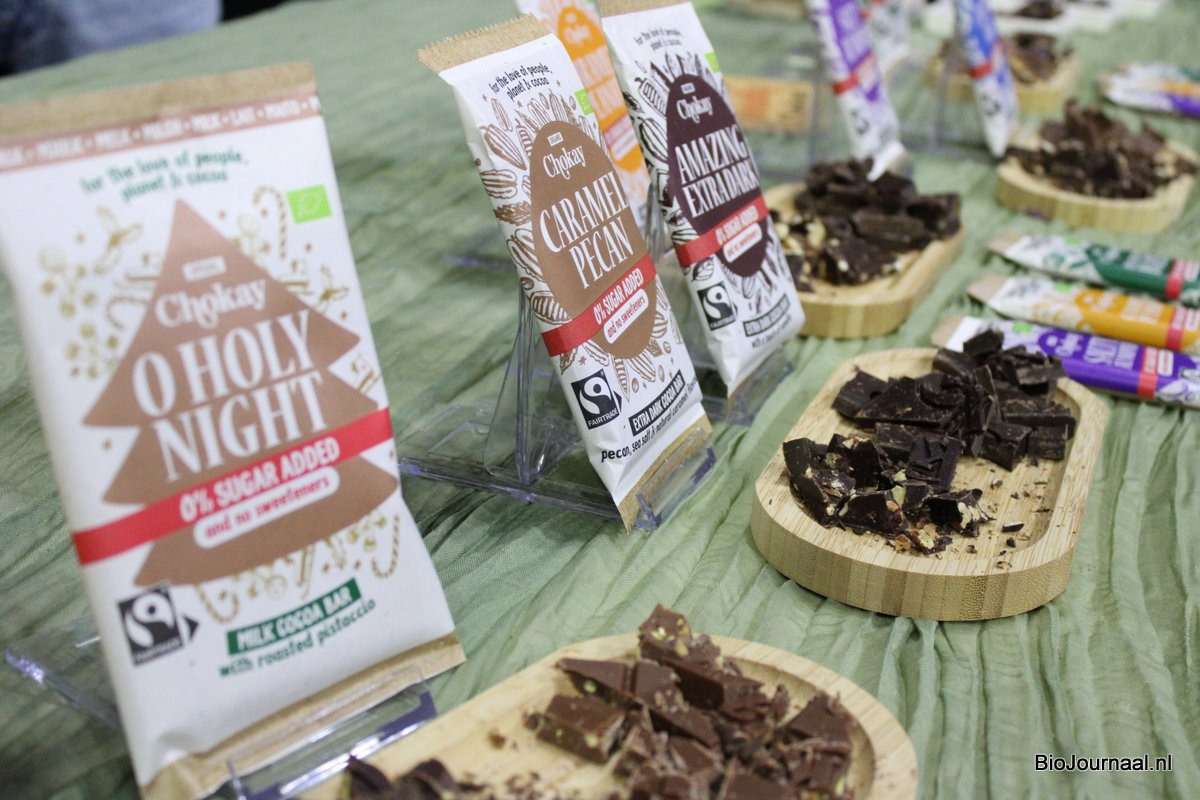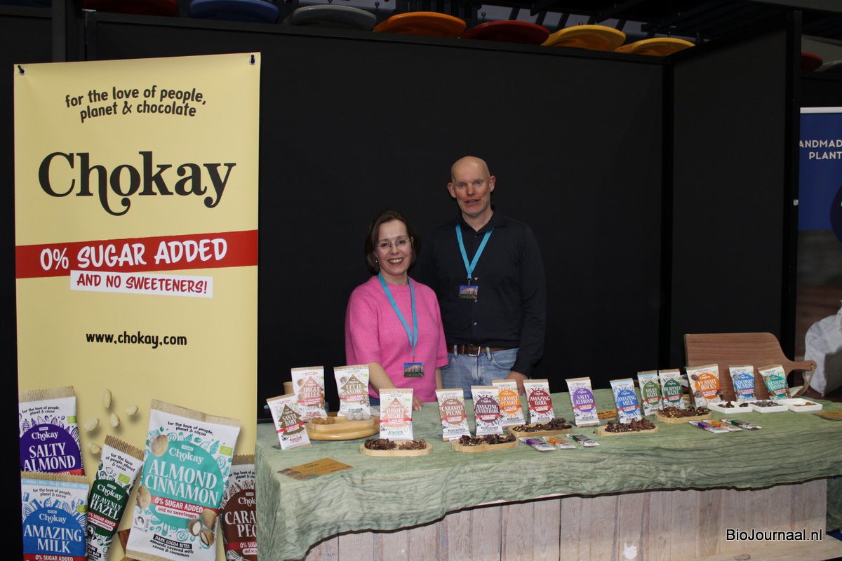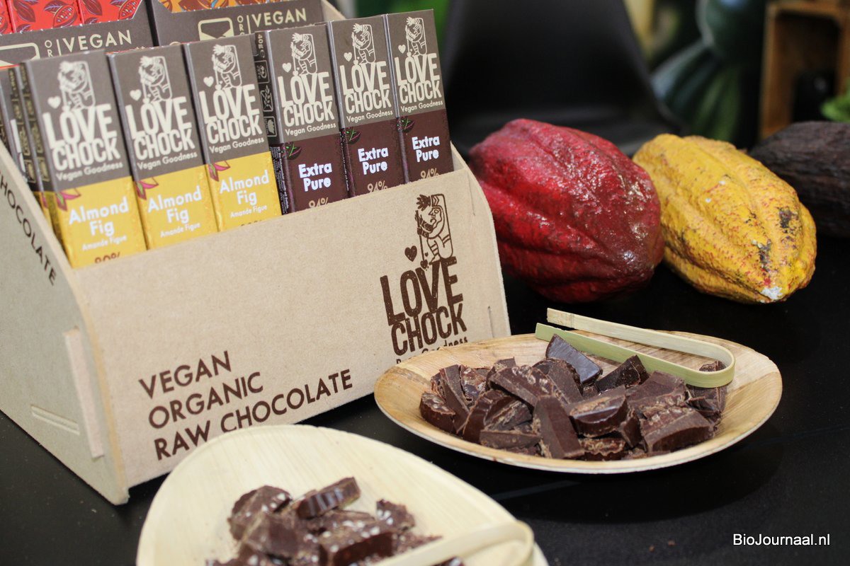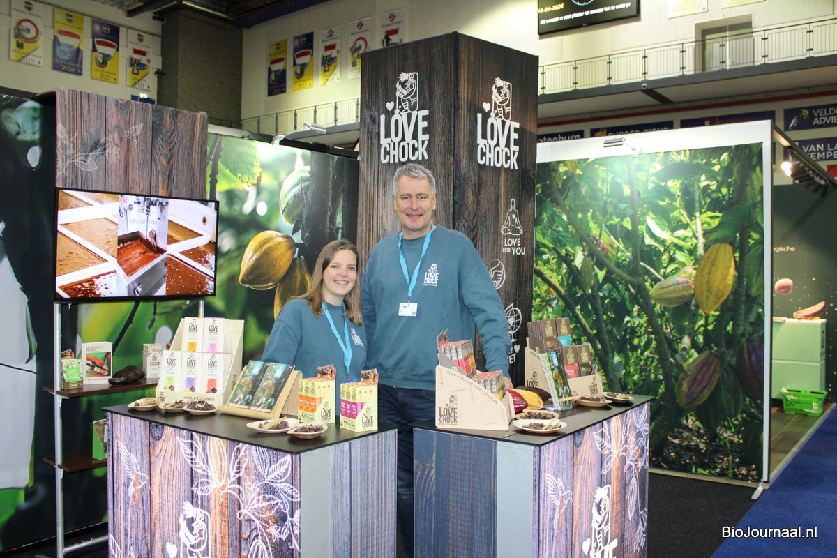 Tom Wiersma en Liz Wijker van Lovechock met hun veelzijdige range aan vegan chocola.