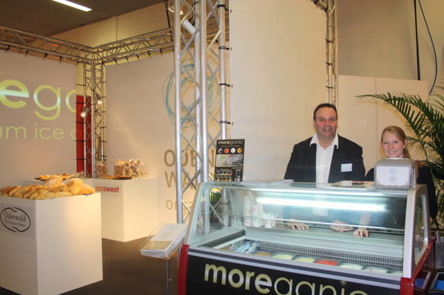 Michael Fase en Janna van Rijn achter de ijskraam in de stand van Odenwald Organic. Hier kon je ijs proeven en werd het biologisch brood van The Organic Bakery getoond. Evenals het GoedSap van Theo en Zongo (vijfde in Vers Top 100).