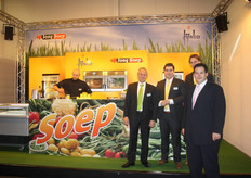 Inmiddels een ruim assortiment aan bio-soepen verkrijgbbaar bij Jong Soep (gebonden, helder en basis). Bezoekers konden onder meer broccoli-bloemkoolsoep proeven. Van links naar rechts: Jan Willemse, Mike Huijbreghts, Thijs Vergouwen en Koen de Jong.