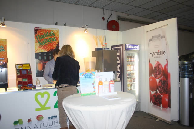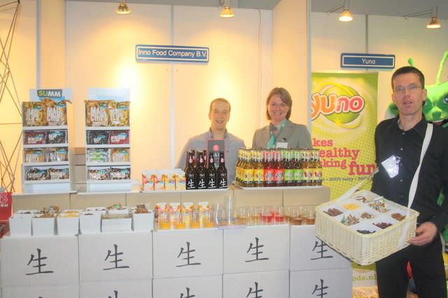Inno Food Company liet de door hen vertegenwoordigde bio-producten zien én proeven. In de stand stonden Ewout de Groot, Maud Stork en Maarten Rijninks (van FairConnect).