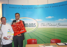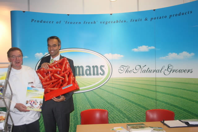 Luc Sommersdijk en Willem Ruisbroek in de stand van Oerlemans, vele soorten diepvriesgroente in zak. Zij deelden zelfs een speciale boodschappentas uit, met apart koelvak.