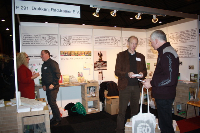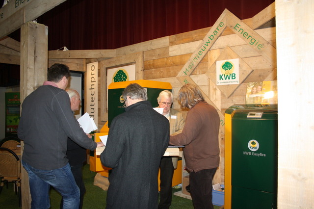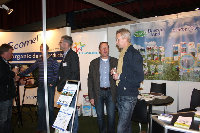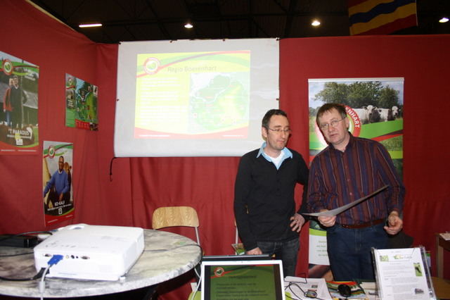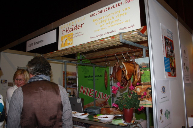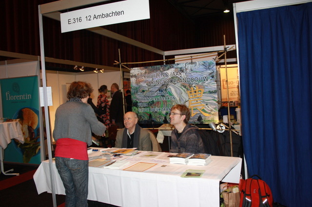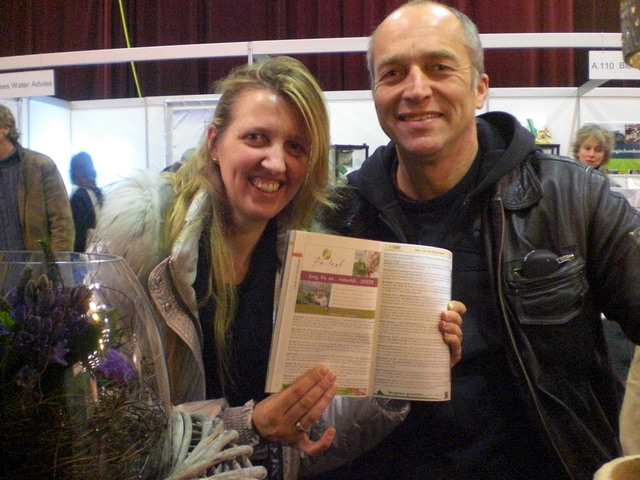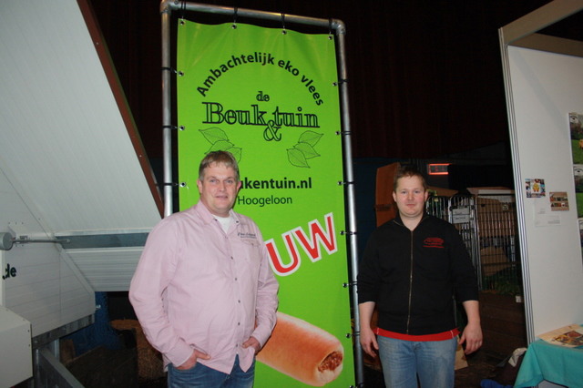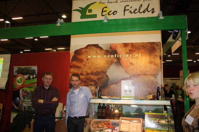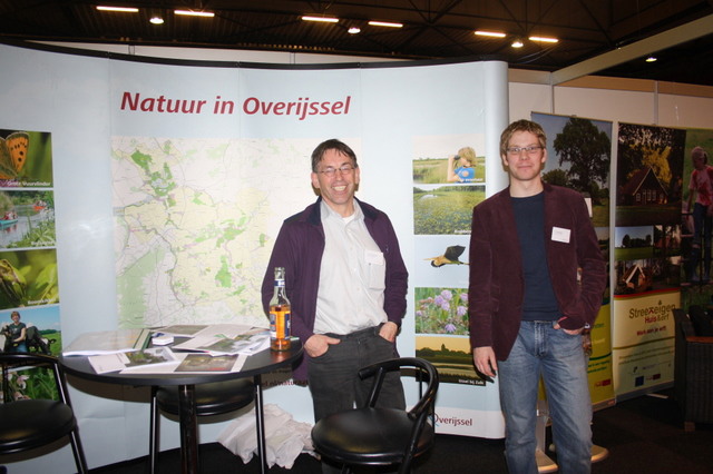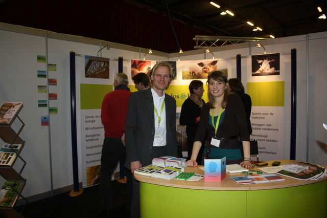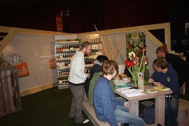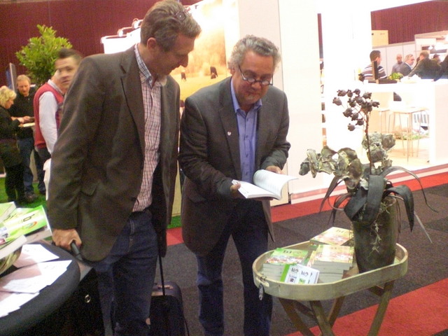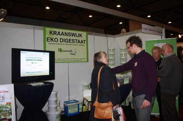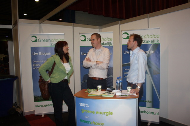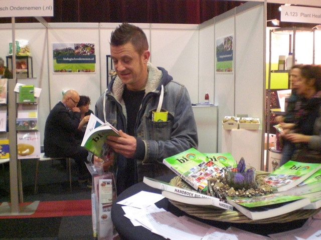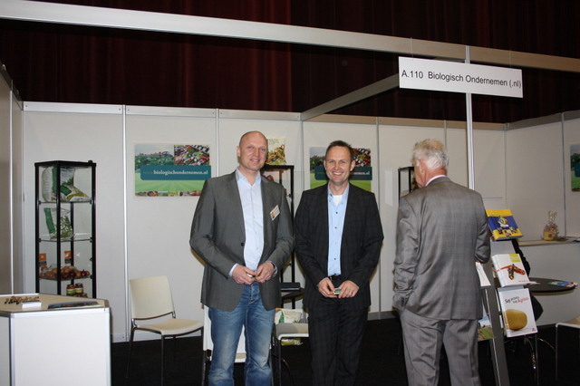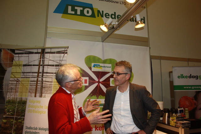 Even pauzeren bij de stand van het Biojournaal. Rechts Arie Verburg van FME.