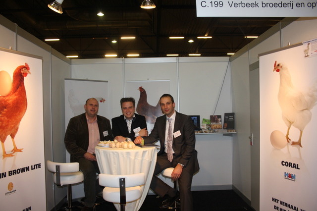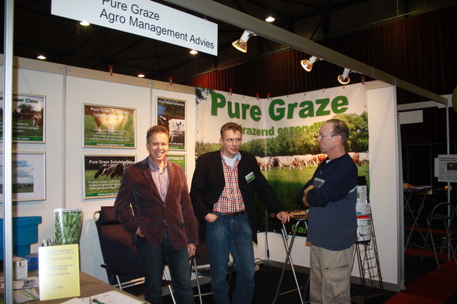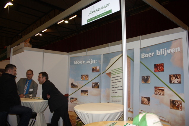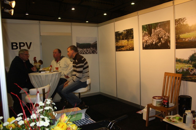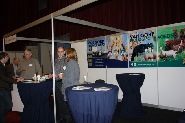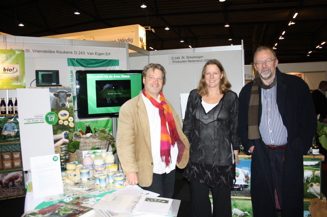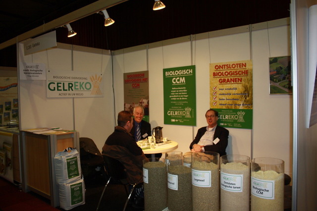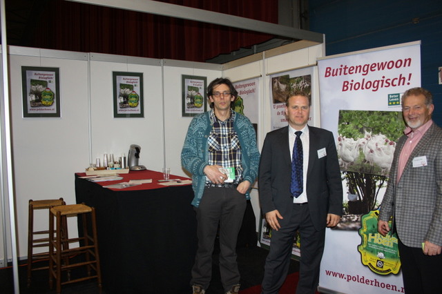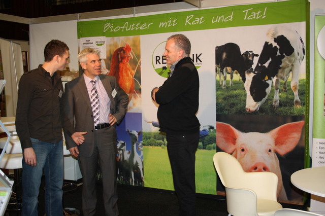 Georges van de Wert, Arno van Gorp en Hanna Pluimes in gesprek in de stand van Van Gorp Biologische Voeders