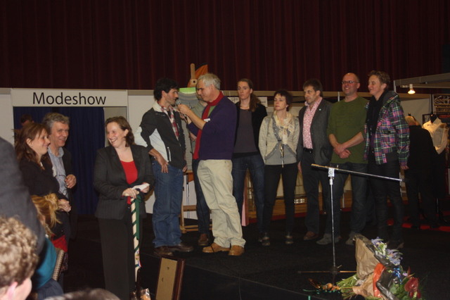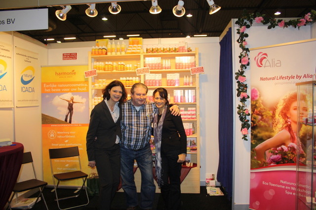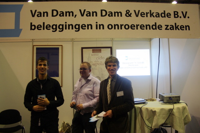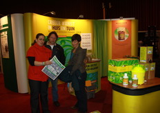 Bastian Bais en Jeroen Knuft willen ook nog even poseren met hun stand. In het midden Marieke Eskes.