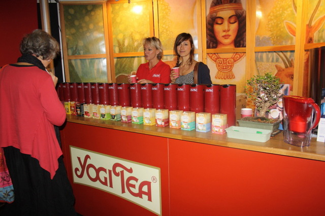 Mirelle Stolte en Kira de Vreeze laten met plezier iedereen van Yogi Tea proeven.
