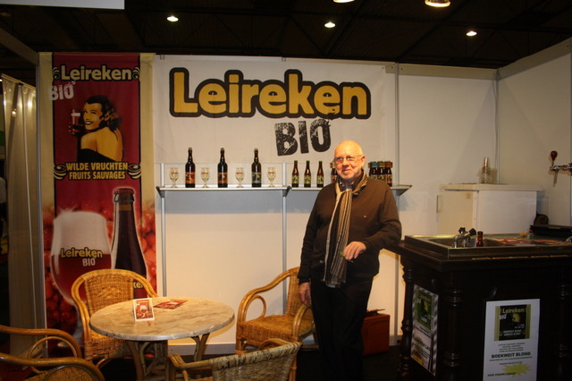 Leirekenbier zoekt het over de grens, Marcel Heuninck vertelt enthousiast over het Belgische biologisch bier. Er was een gratis biertje voor iedereen die een printje van de aankondiging op Biojournaal meebracht.