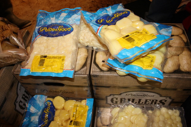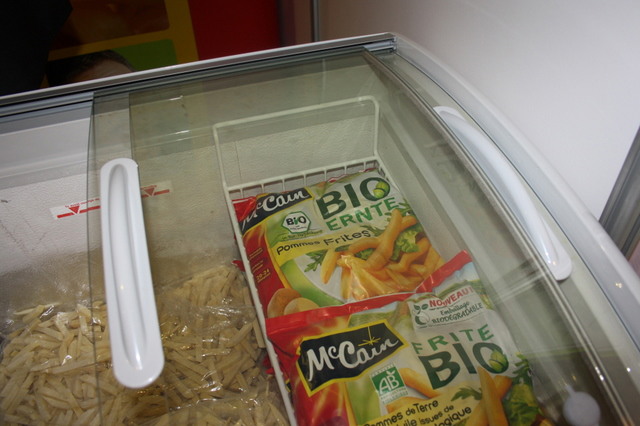 Bij McCain bakten ze de hele dag door biologische frieten. Albert-Jan Smelt en Tim Olsthoorn vullen samen de bakjes.
