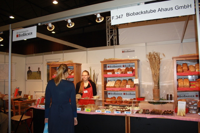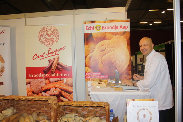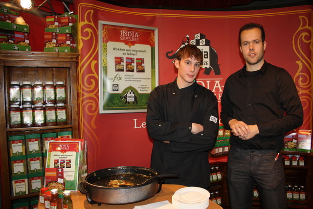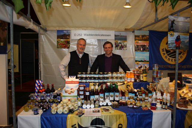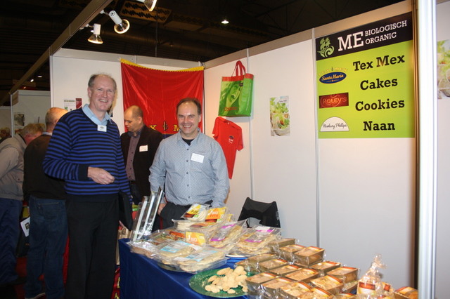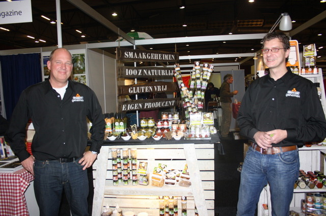 Gjalt Landman en Erik van Luyn (rechts) vertellen graag over het productaanbod van Market Endeavour, de stand ligt vol met houdbare bakkerijproducten.