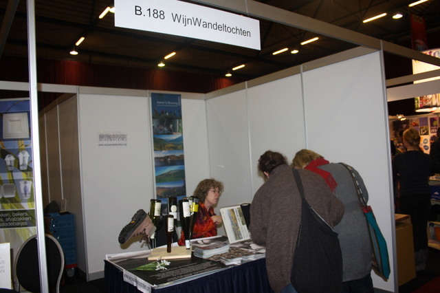 Bezoekers vragen bij Jeanet Bruining informatie op over de wijnwandeltochten.