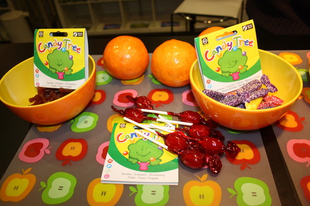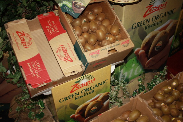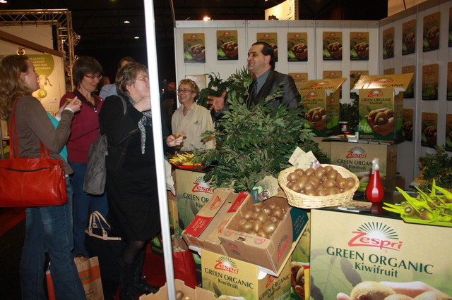 Drukte bij Zespri. Ton Theunissen en Patricia Lodewijks laten de bezoekers kiwi proeven.