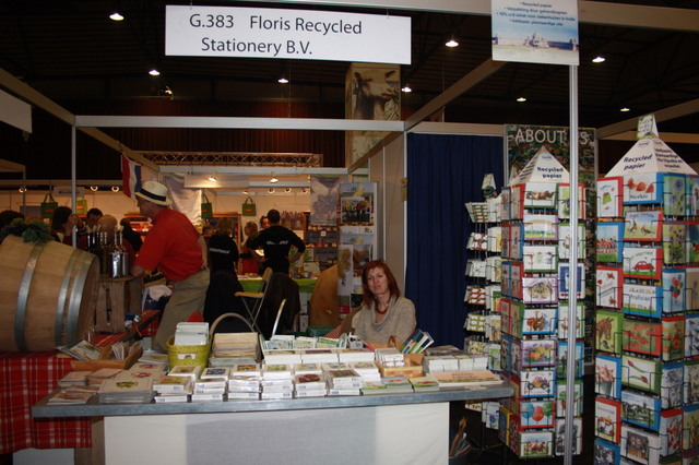 Sjannie Floris met wenskaarten en schrijfwaar van recycled papier.