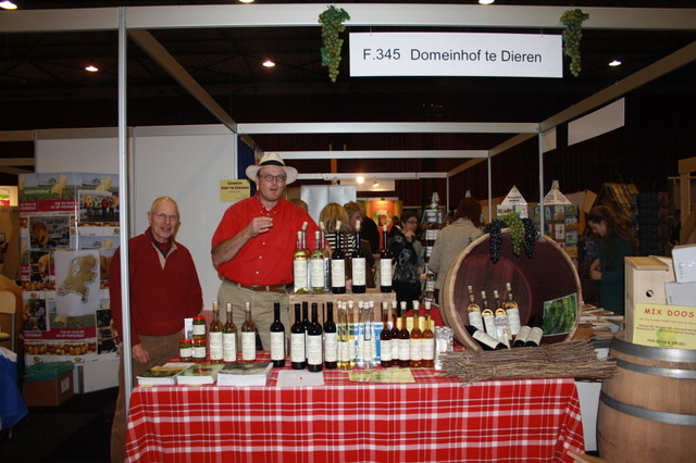 Gerard Liesker en Youp Cretier met hun wijnen. Youp lust er zelf ook wel graag wat van.
