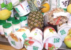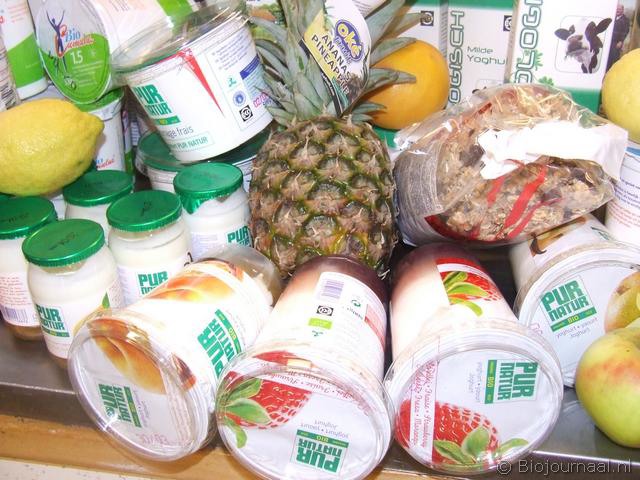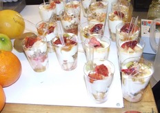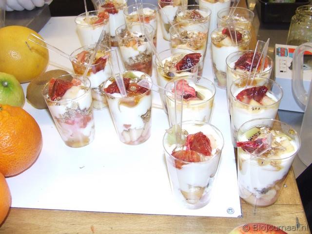 Het hapje waar tussen het winkelen door van kon worden geproefd: Yoghurt met muesli en stukjes fruit.