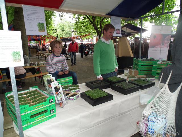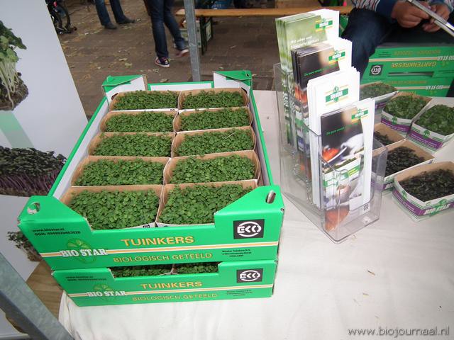 Abe helpt zijn vader Thijs Hoogveld bij de presentatie van de tuinkersen van Biostar.